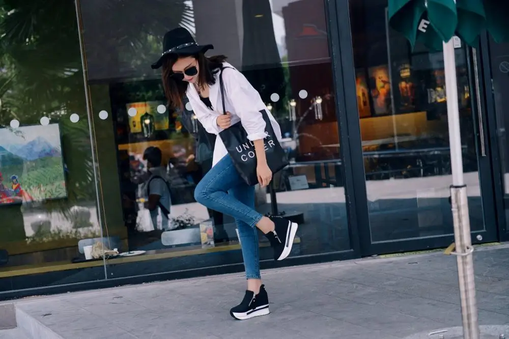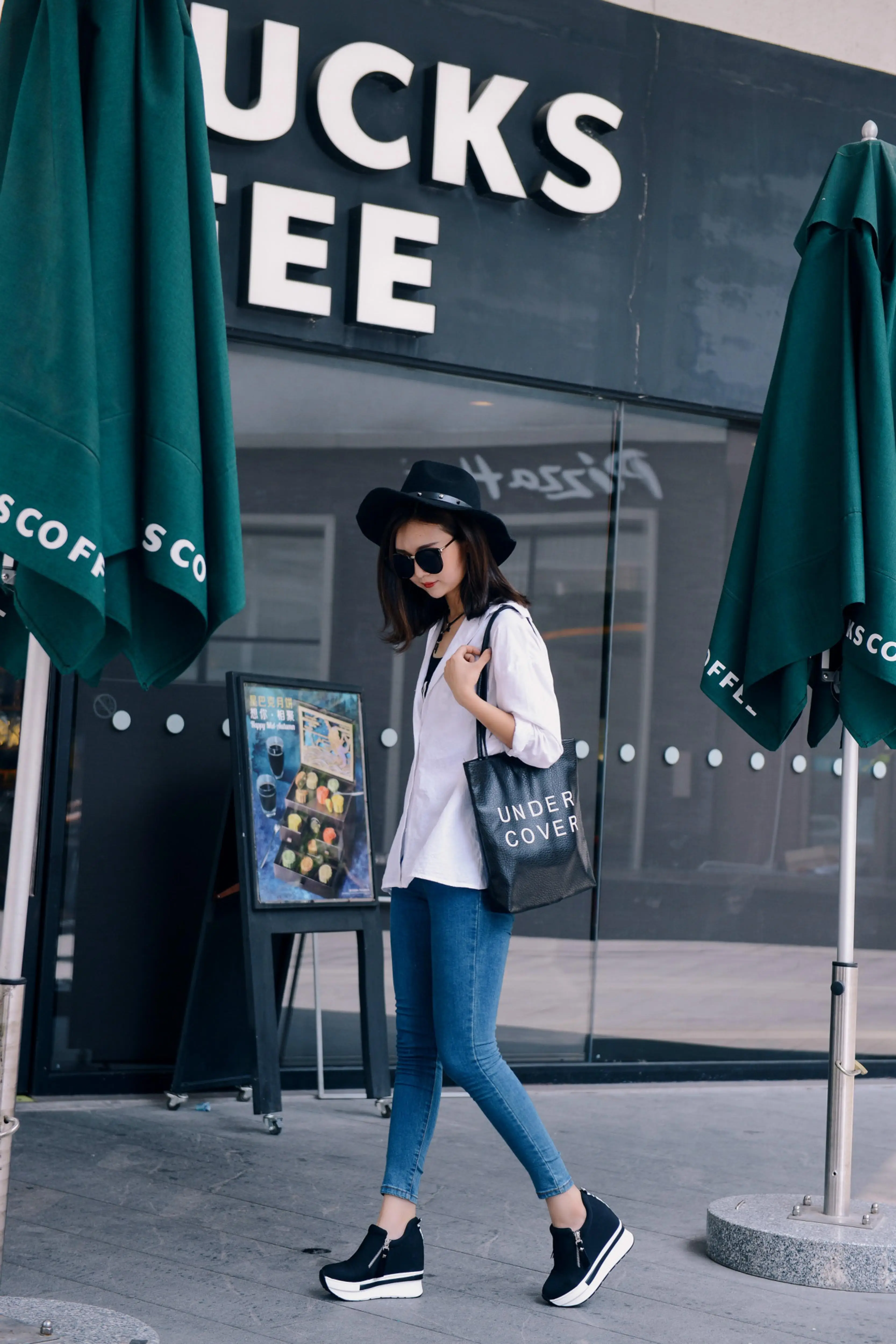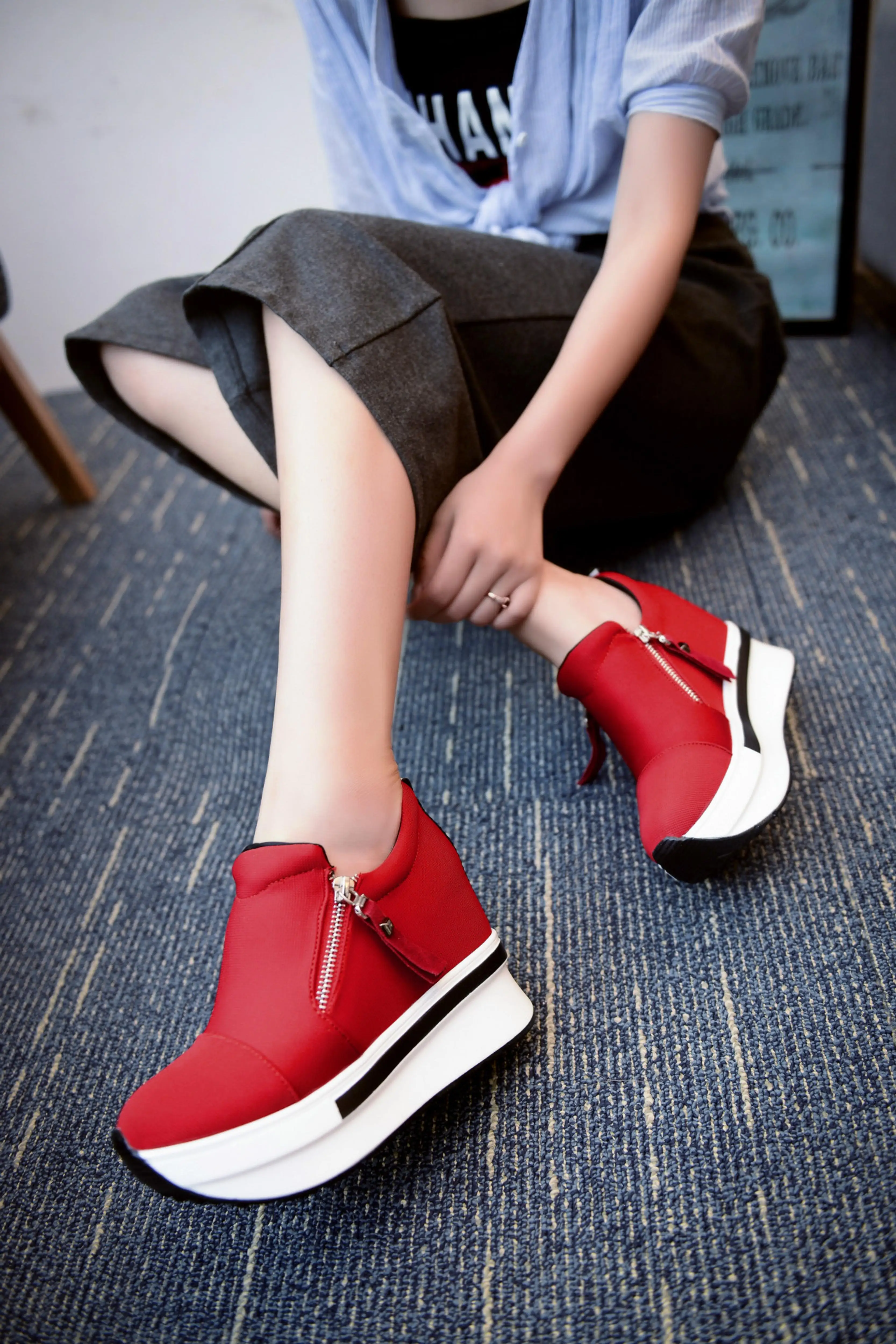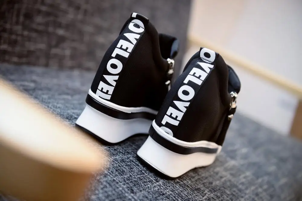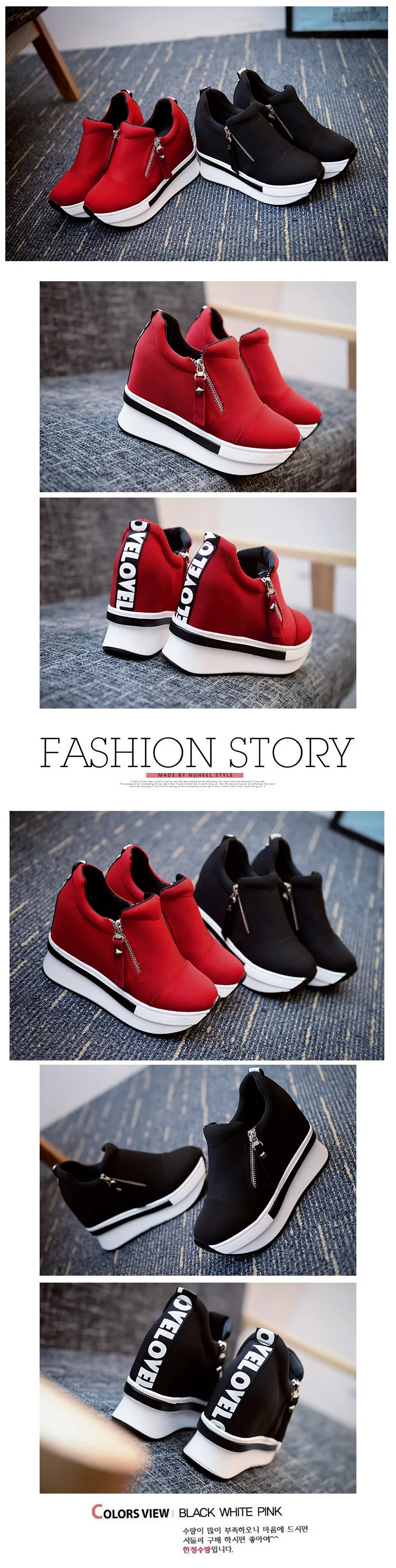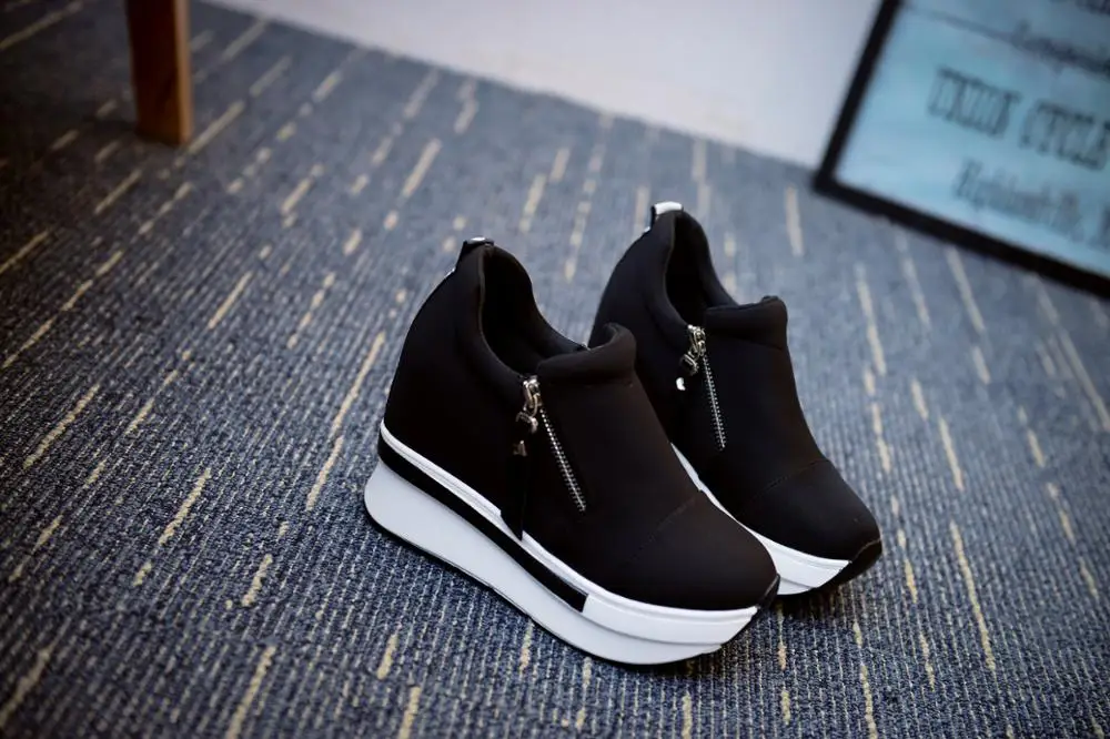 Женская повседневная обувь на танкетке, на молнии, визуально увеличивающая рост, дышащие черные женские кроссовки на плоской подошве, сезон весна 2019
