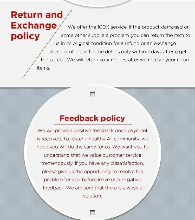 О доставке 1) доставка по всему миру .. (За исключением некоторых стран и APO/FPO) 2)S & H не включает пошлины, покупатели несут ответственность за любые местные налоги или другие импортные сборы. 3) Заказы обрабатываются в течение обещанного количества дней после подтверждения оплаты. 4) При заказе мы грузим только на подтвержденные адреса. Ваш адрес заказа должен совпадать с вашим адресом доставки. 5) Представленные изображения фактически не являются товаром и предназначены только для справки. 6) ВРЕМЯ ДОСТАВКИ определяется перевозчиком и не включает в себя выходные и праздничные дни. Сроки доставки могут меняться, особенно во время курортного сезона. 7) Если вы не получили товар в течение 39 дней с момента оплаты, просим связаться с нами. Мы отследим отправку и свяжемся с вами как можно скорее. Наша цель – удовлетворение клиентов! О оплате 1) Мы принимаем Ali West Union, TT, PP и платежный процессор ESCROW. 2) Оплата должна быть произведена в течение 7 дней с момента заказа. О отзывы мы поддерживаем высокие стандарты качества выставьте нам 5 звезд, и стремимся к 100% удовлетворенности клиентов! Положительные отзывы очень важны для нас. Просим вас прежде чем выставлять нейтральную или отрицательную оценку при обратной связи немедленно свяжитесь с нами. Чтобы мы могли удовлетворительно решить ваши проблемы.