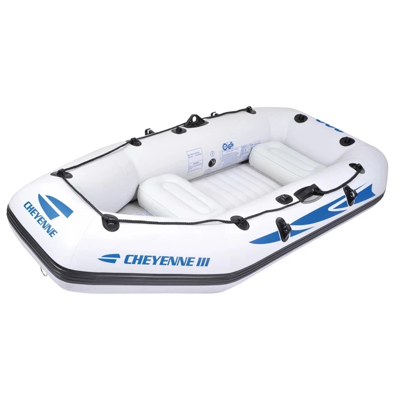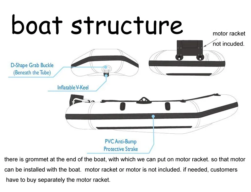 3 воздушные камеры, более безопасные; 1 мм высокой плотности Толстый ПВХ ламинированный материал, прочный и долговечный; Прочные Жесткие защитные ленты вокруг лодки и снизу, полная защита; V-образная форма киля внизу, стабильный и лучший контроль направления; 4 прокладки в задней части лодки, доступны для крепления двигателя, крепление двигателя является необязательным; Полный набор аксессуаров, алюминиевые весла, ручной насос двойного действия; Надувные стульчики, сумка через плечо, веревочка, держатель для весла, замок для весла, руководство по эксплуатации, комплект для ремонта.