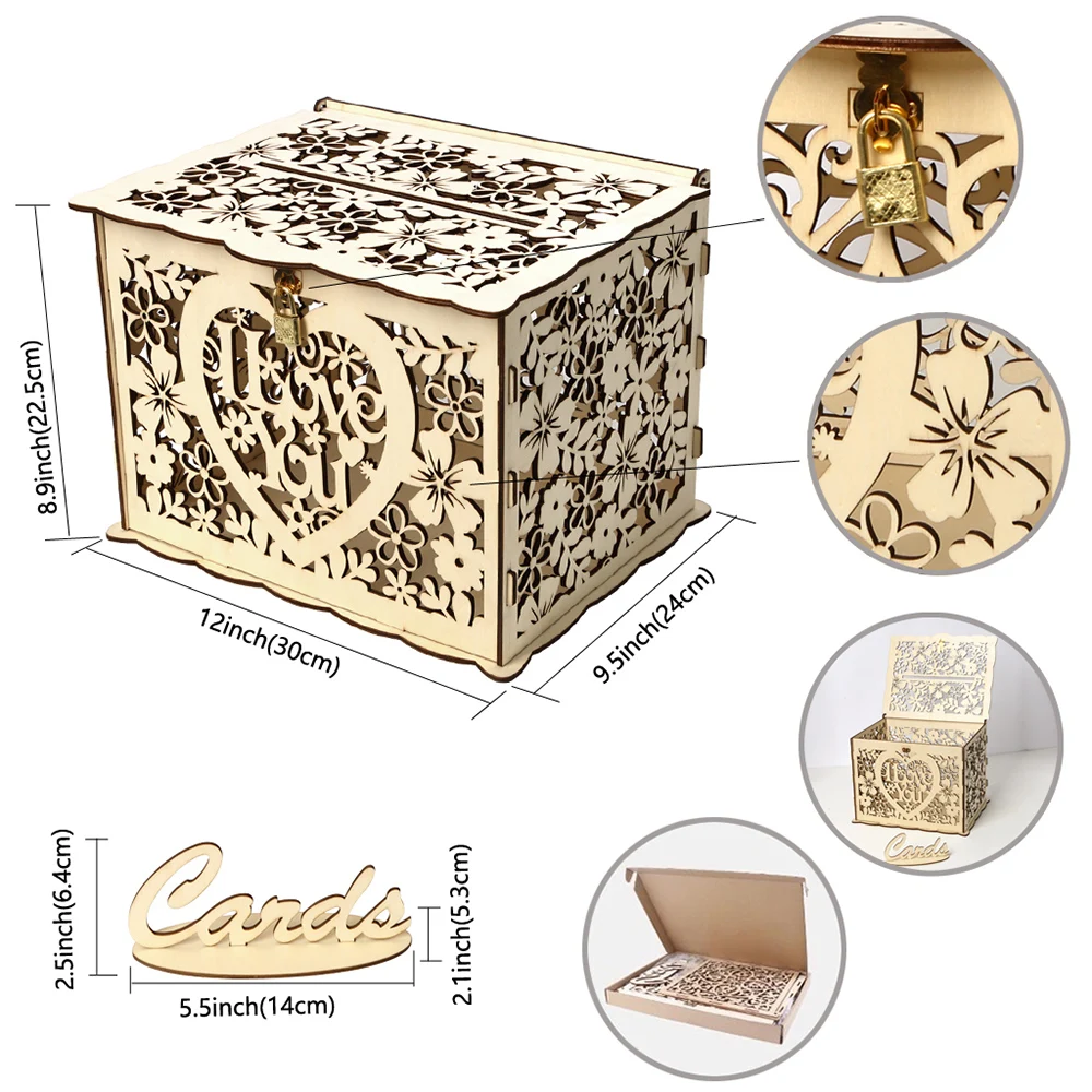 DIY Wedding Card Box Wooden Money Box with Lock Wood Gift Box Card Holder for Wedding Decoration Party Supplies Storage Money