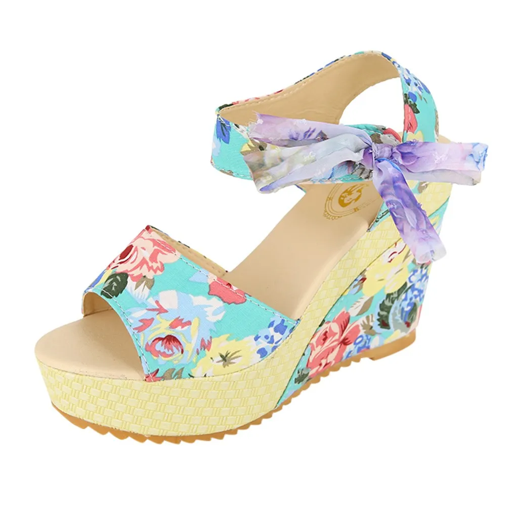 Женские летние туфли на танкетке с цветочным принтом Сандалии круглый носок ПовседневноеОбувь