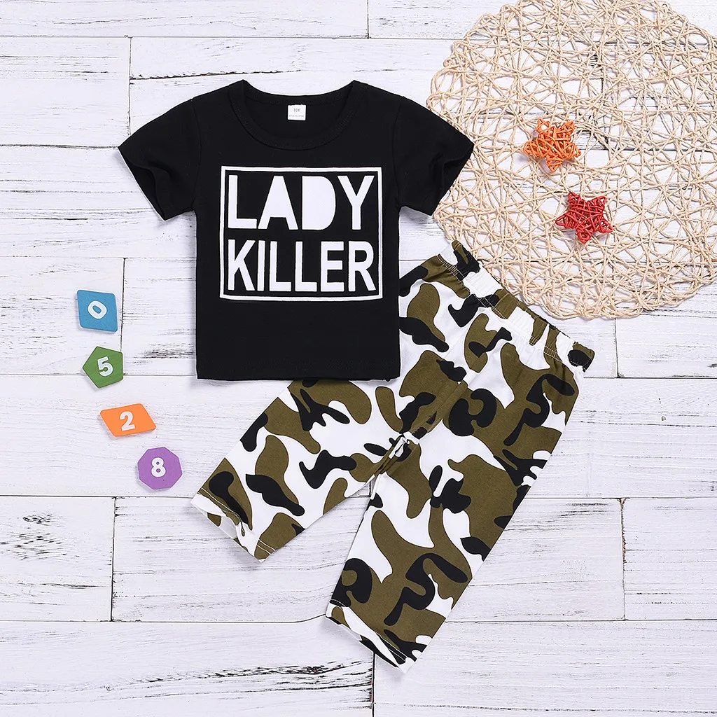 Футболка с буквенным принтом для маленьких мальчиков и девочек; Топ + камуфляжные штаны; Комплект одежды