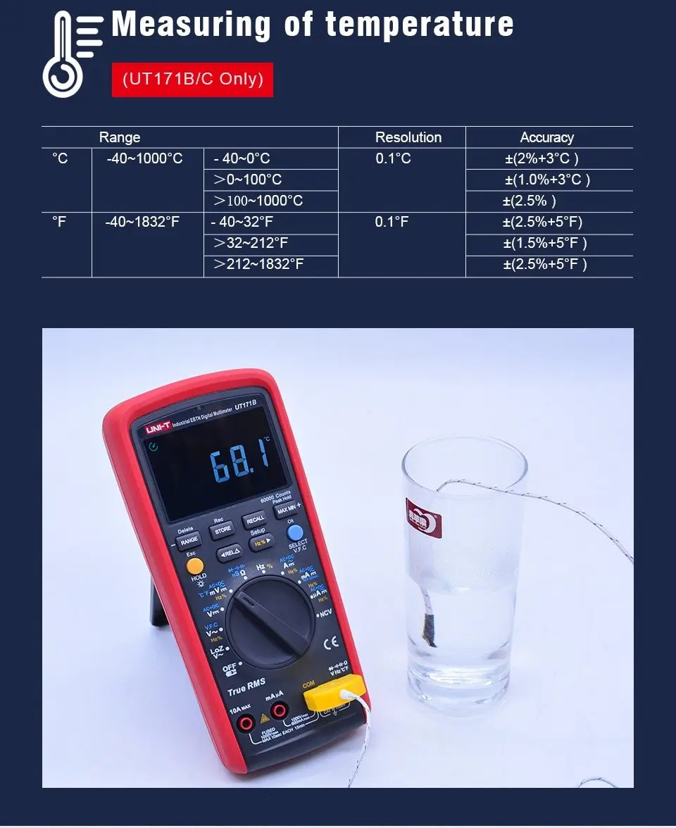 Серия UT171-Это мультиметры промышленного класса, используемые профессионалами. Его встроенный квадратный волновой выход полезен для устранения проблем с промышленными контрольными сигналами. Его функция LoZ (ACV) может использоваться для определения остаточного (ghost) напряжения в больших конденсаторах. Oled-дисплей UT171C's идеально подходит для работы при низких температурах до-30 °C.