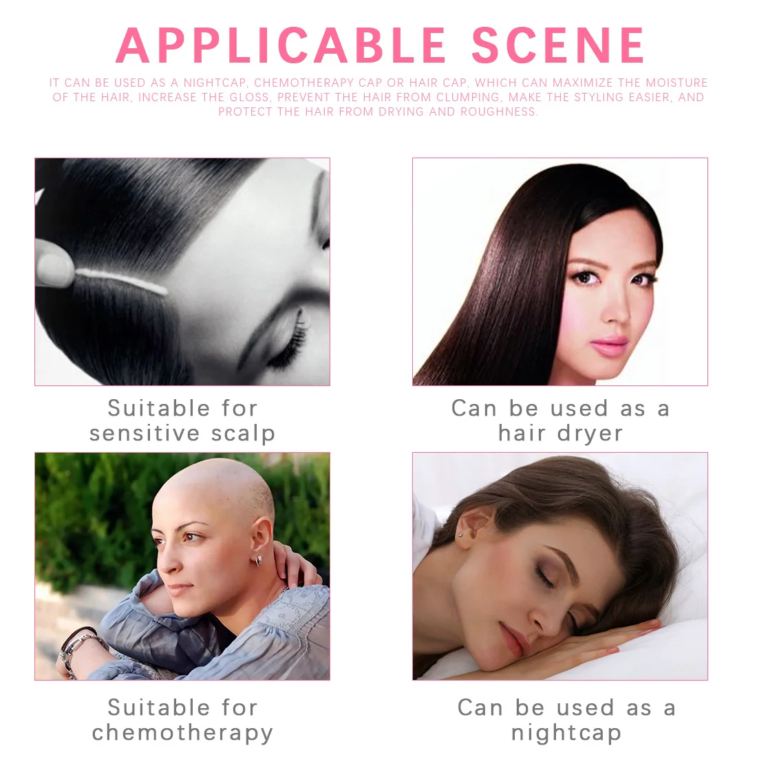 Можно использовать для сохранения волос во время сна или для сохранения макияжа, мытья лица, химиотерапии, выпадения волос или душа.