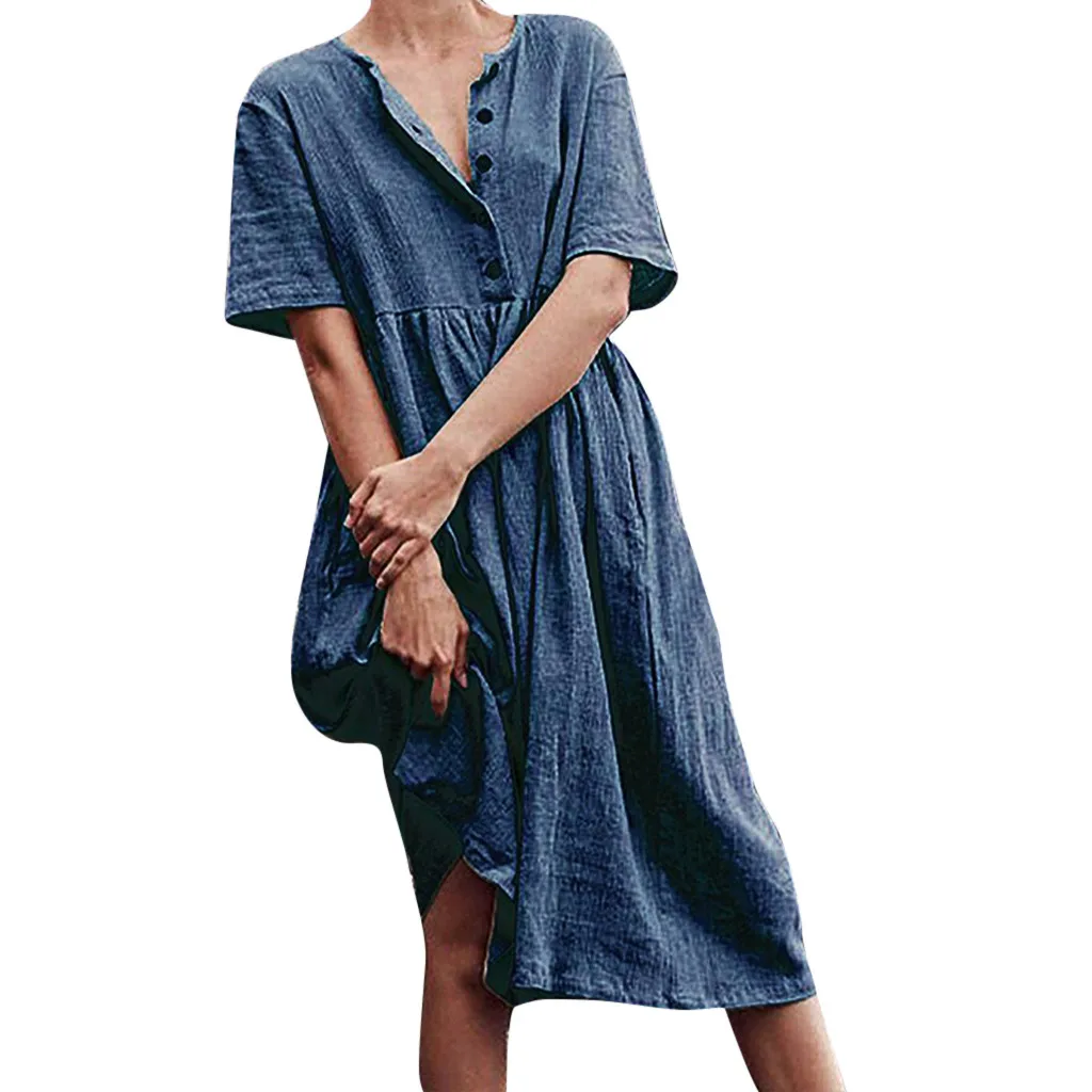Женское однотонное легкое платье из хлопка и льна с круглым вырезом и пуговицами