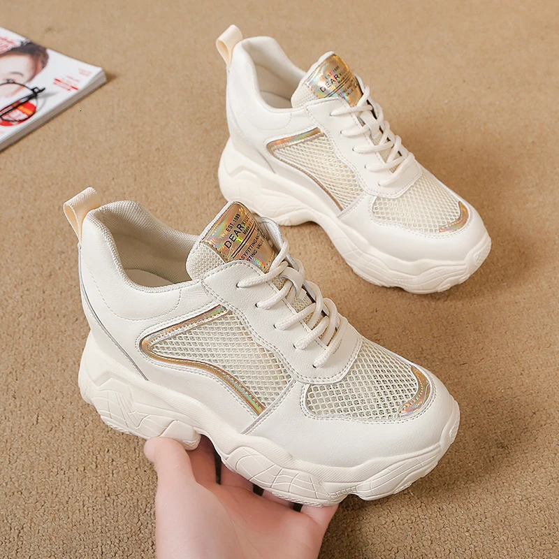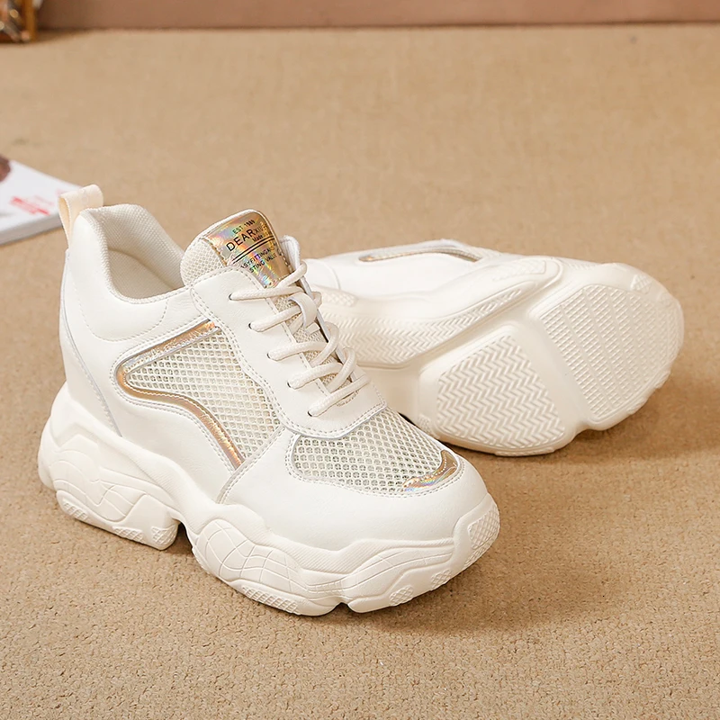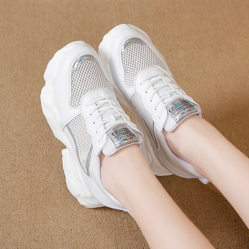 Женские кроссовки с дышащей сеткой, на скрытой танкетке 8 см, повседневная обувь белого цвета, обувь на скользящей платформе, лето 2019