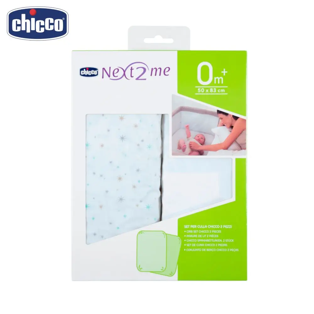 Набор включат себя 2 хлопковые простыни размером 50 х 83 см. Подходит для Chicco Next2me, Chicco Next2me Dream, Chicco Next2me Magic и Chicco Lullago Travel Crib.