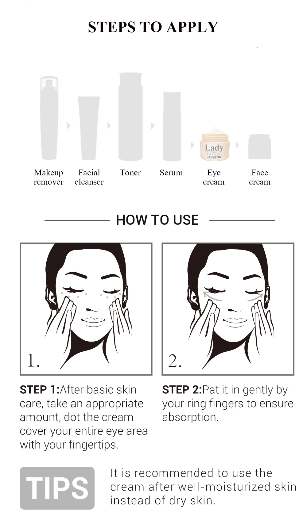Шаг 1: после основного ухода за кожей, возьмите необходимое количество, наденьте крем на всю область вокруг глаз кончиками пальцев