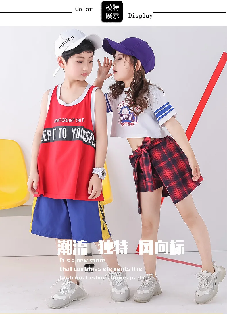 Новая сценическая одежда костюм для джазового танца одежда в стиле хип-хоп детская футболка для девочек, юбка Топ на бретелях для мальчиков, костюм с короткими штанами