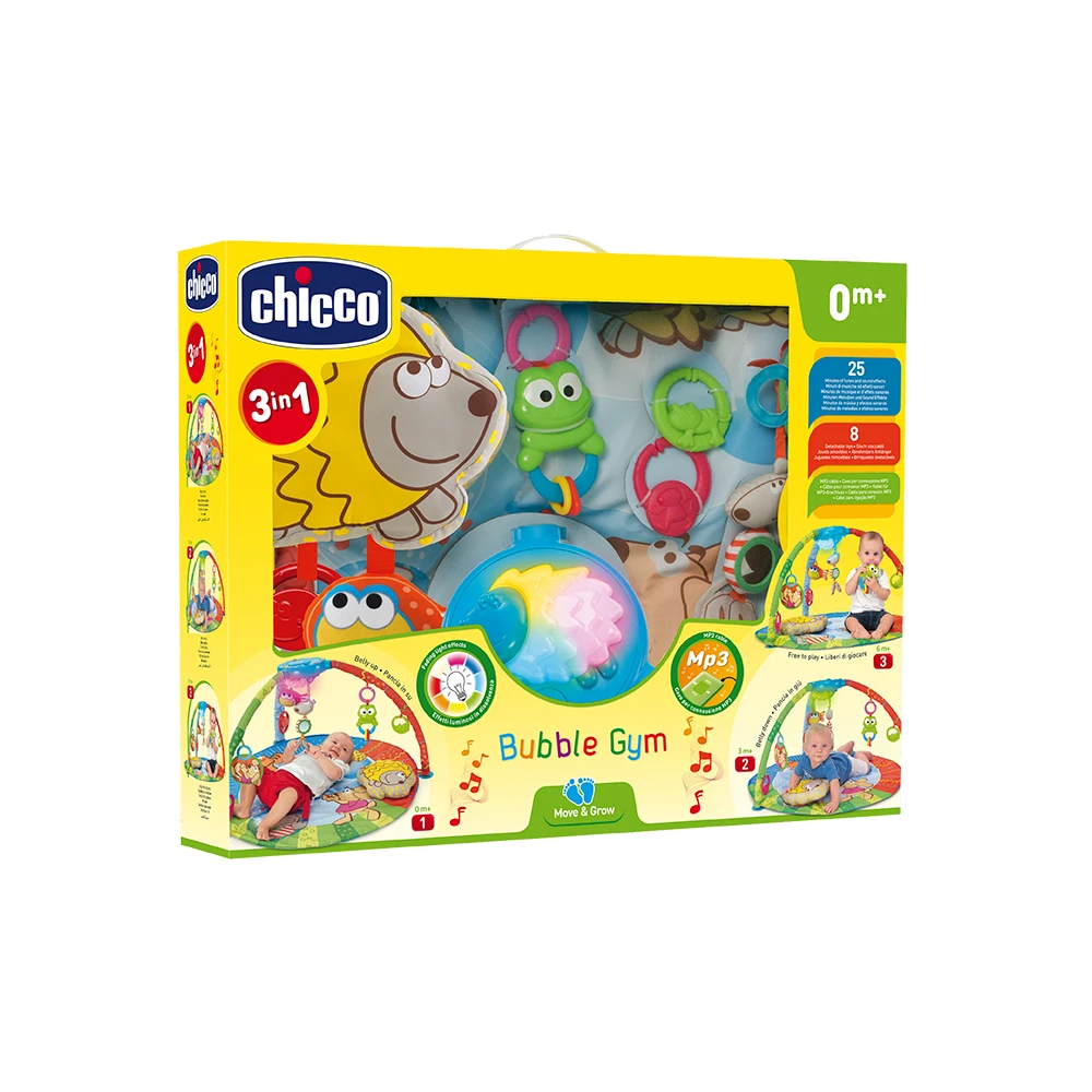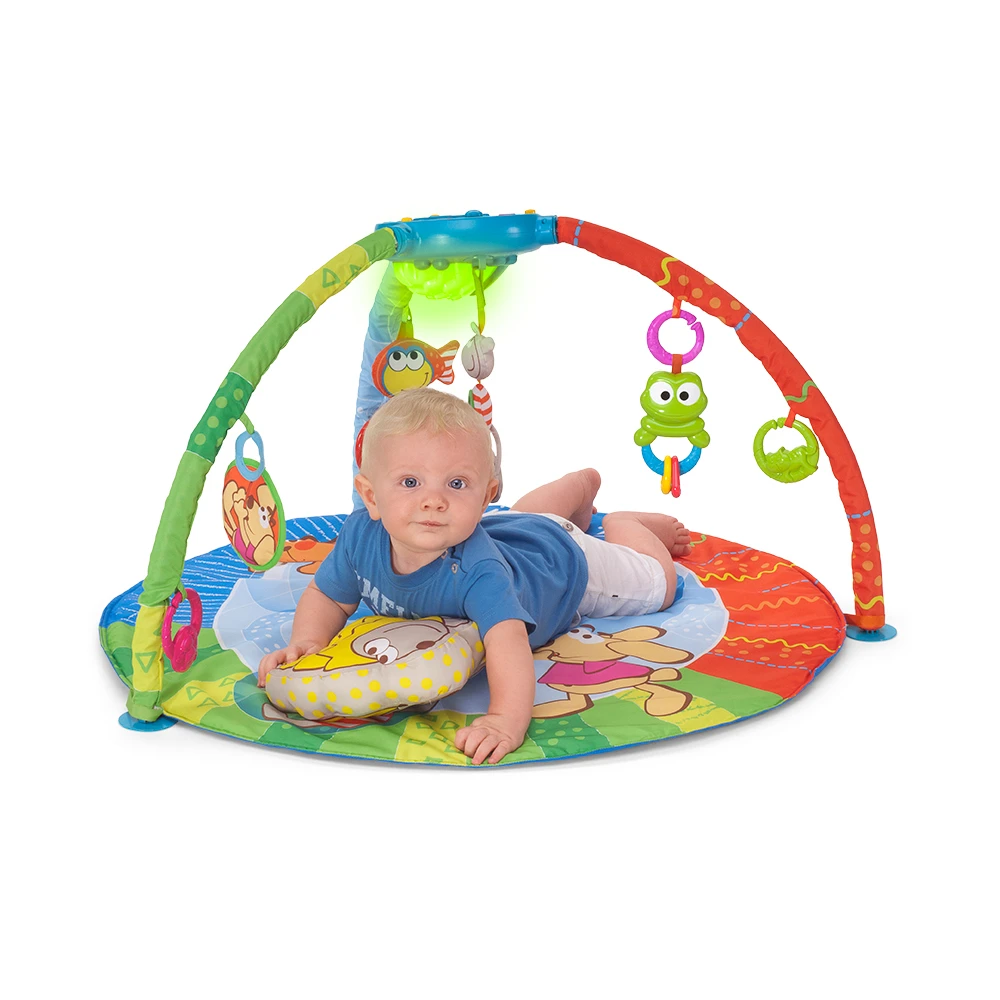 Chicco "Bubble Gym" - идеальное место, где малышу будет интересно играть и просто отдыхать, это привлекательный яркий коврик со съемной дугой, множеством подвесных игрушек (пластиковые прорезыватели для зубов, зеркальце, погремушки) и мягкой подушкой в форме забавного ежика. Электронная активная панель – это множество разнообразных световых эффектов, 25 минут музыки и звуковых эффектов. Также есть возможность подключения к коврику mp3-плеера.