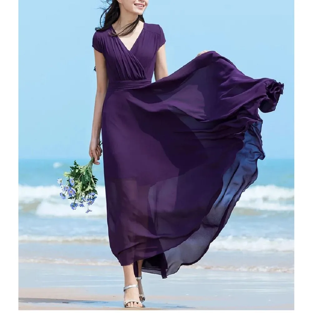 Вам понравится это милое длинное платье в вашем Летних прогулок. Это платье имеет красивый дизайн с коротким рукавом и V-образный вырез горловины. Вы можете сочетать с вашими босоножками на блочном каблуке или туфлями без задника Внешний вид.