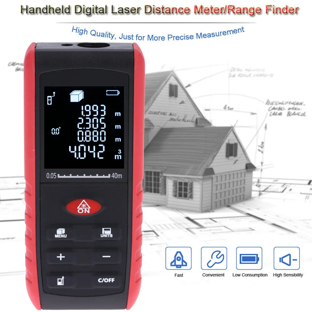 Лазерный дальномер с высокой точностью может использоваться для измерения расстояния, площади и объема. Он также используется для непрямого измерения по теореме Пифагора. Продукт является портативным и надежным в измерении, что делает ваши измерения более точными, простыми и быстрыми. Счетчик может быть широко использован в строительстве и промышленности, особенно в больших областях, таких как комнаты, квартиры, здания, недвижимость, фабрики и т. Д.