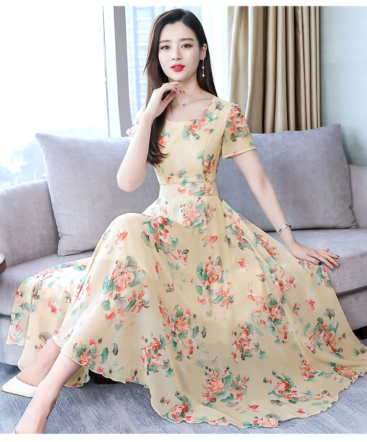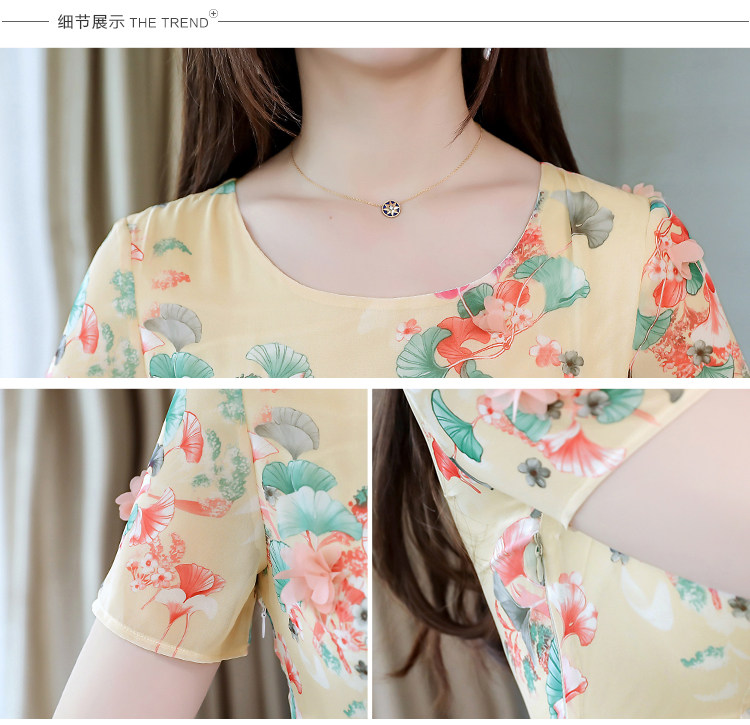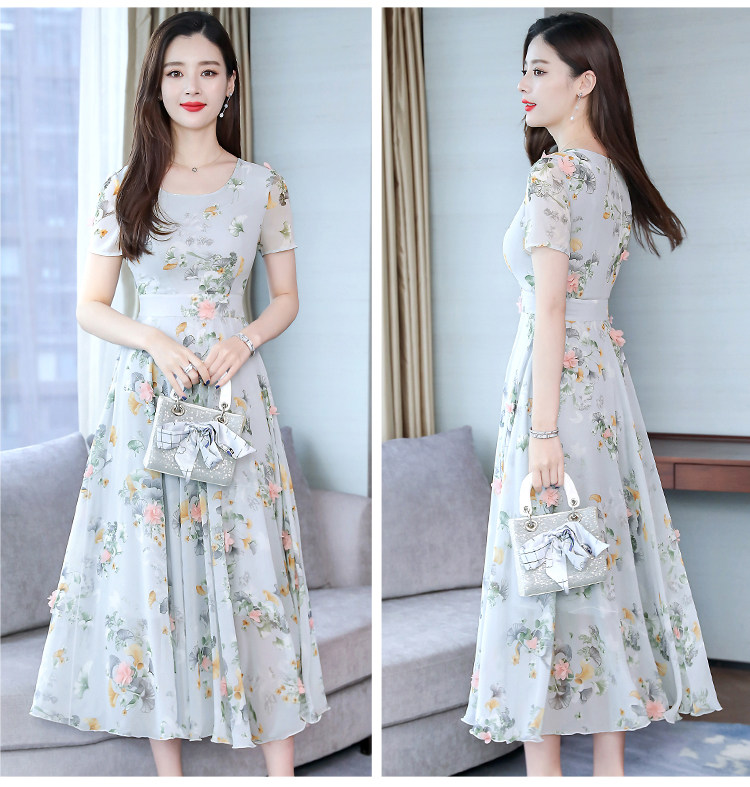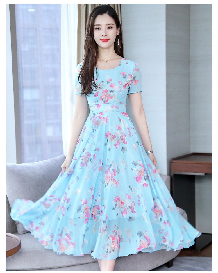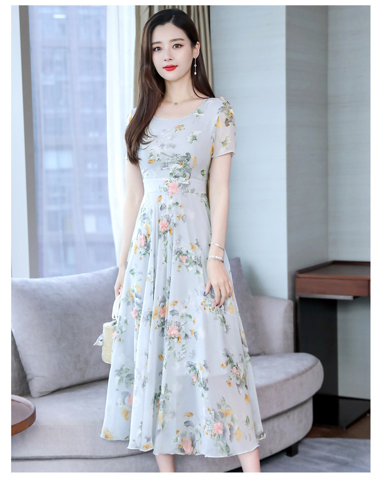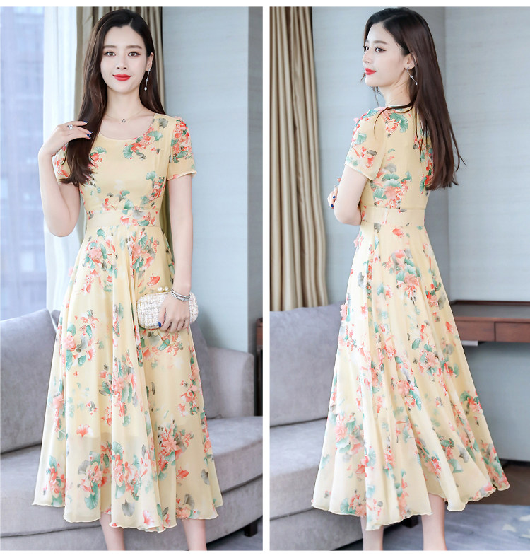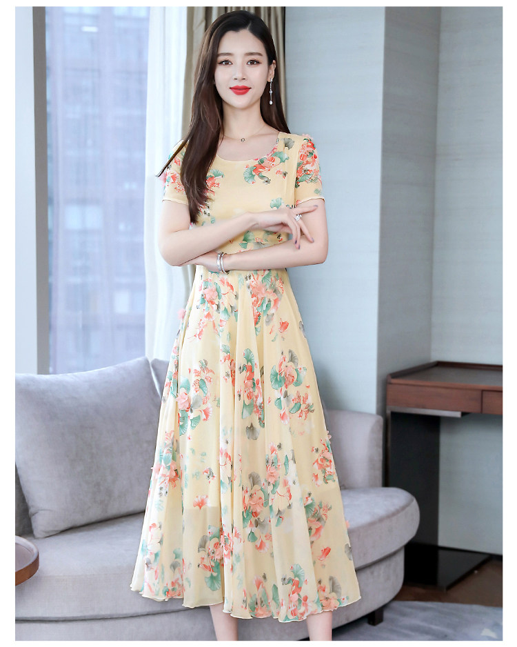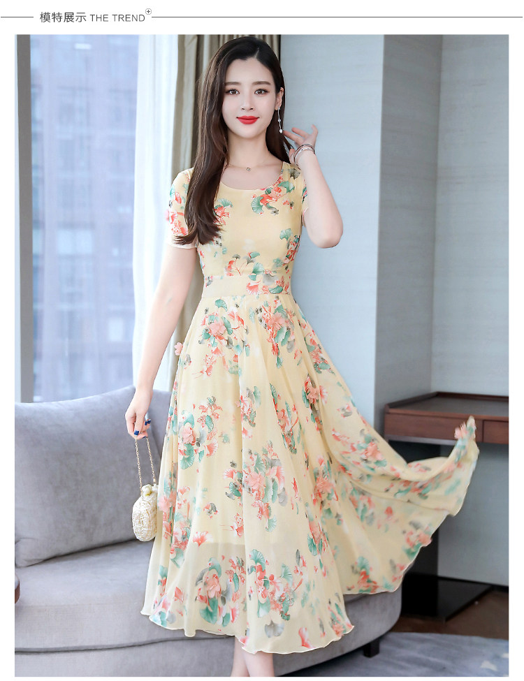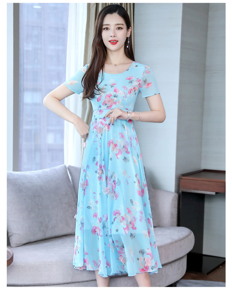 Женское шифоновое платье с коротким рукавом и цветочным принтом, платье с круглым вырезом, лето 2019