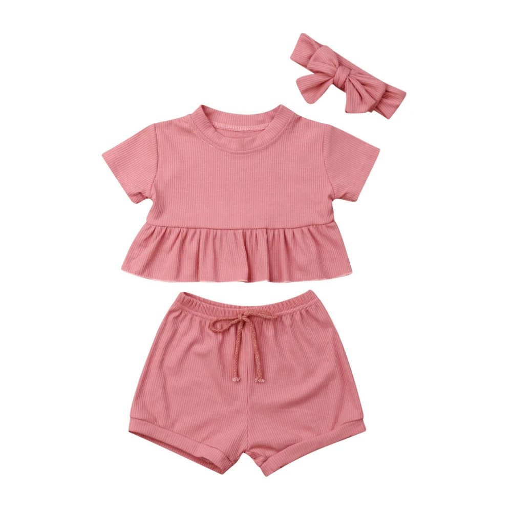 100% новый и высокое качество Модный комплект одежды для маленьких девочек! Модный дизайн, милый Цвет: как на картинке Материал: Смесь хлопка Упаковка: 1 Топ + 1 шорты + 1 повязка на голову Таблица размеров: