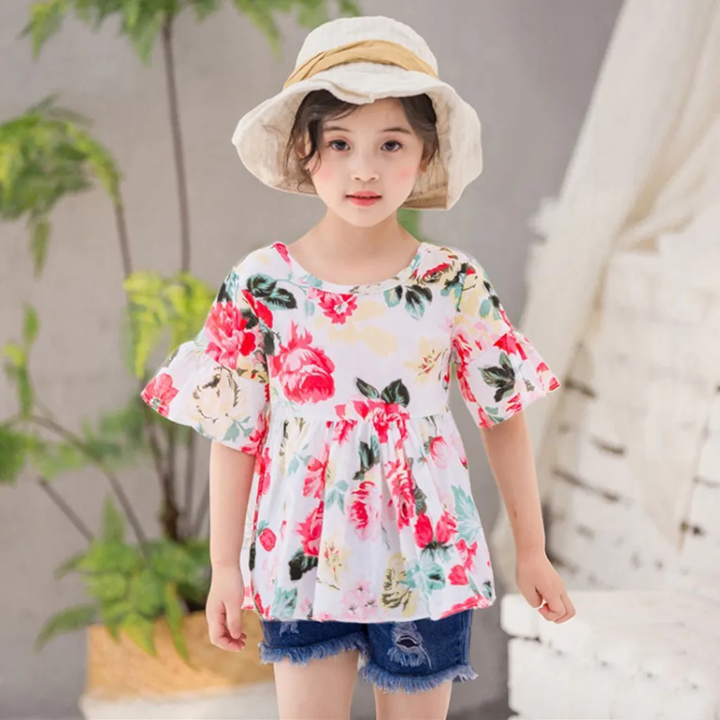 Топы с цветочным принтом и рюшами для маленьких девочек; Однотонный Короткий Повседневный комплект одежды