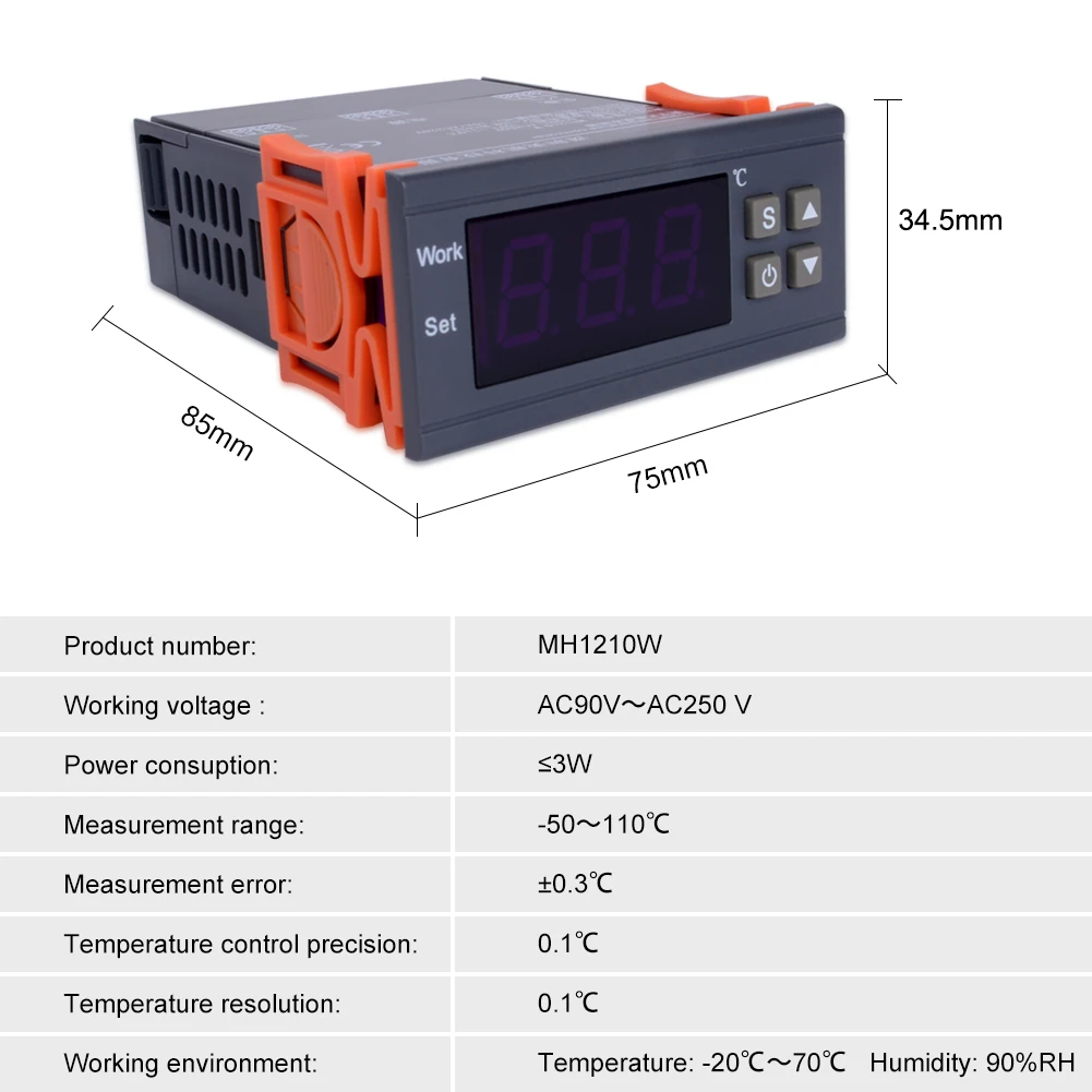Рабочее напряжение: 90 ~ 250V ± 10% В переменного тока, 50/60 Гц Номинальный ток: 10A Потребляемая мощность: ≤ 3 Вт Диапазон измерения: -50 ~ 110 °C Точность измерения: 0,1 °C Погрешность измерений: ± 0,3 °C Точность управления: 0,1 °C Рабочая температура:-20 ~ 70 °C, влажность: 90% без конденсации влаги Датчик температуры: NTC 25 C = 10K B3435 (1 м, без положительного или отрицательного) Выходная нагрузка: нормально открытый 10A/AC 220V Размер изделия: 8,5*7,5*3,5 см/3,4*3 * 1.4in Вес изделия: 93 г/3 унции