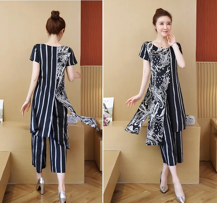 UHYTGF женский летний костюм свободного размера плюс из двух частей, женские модные широкие брюки, тонкие ретро повседневные комплекты из 2 предметов для женщин 415