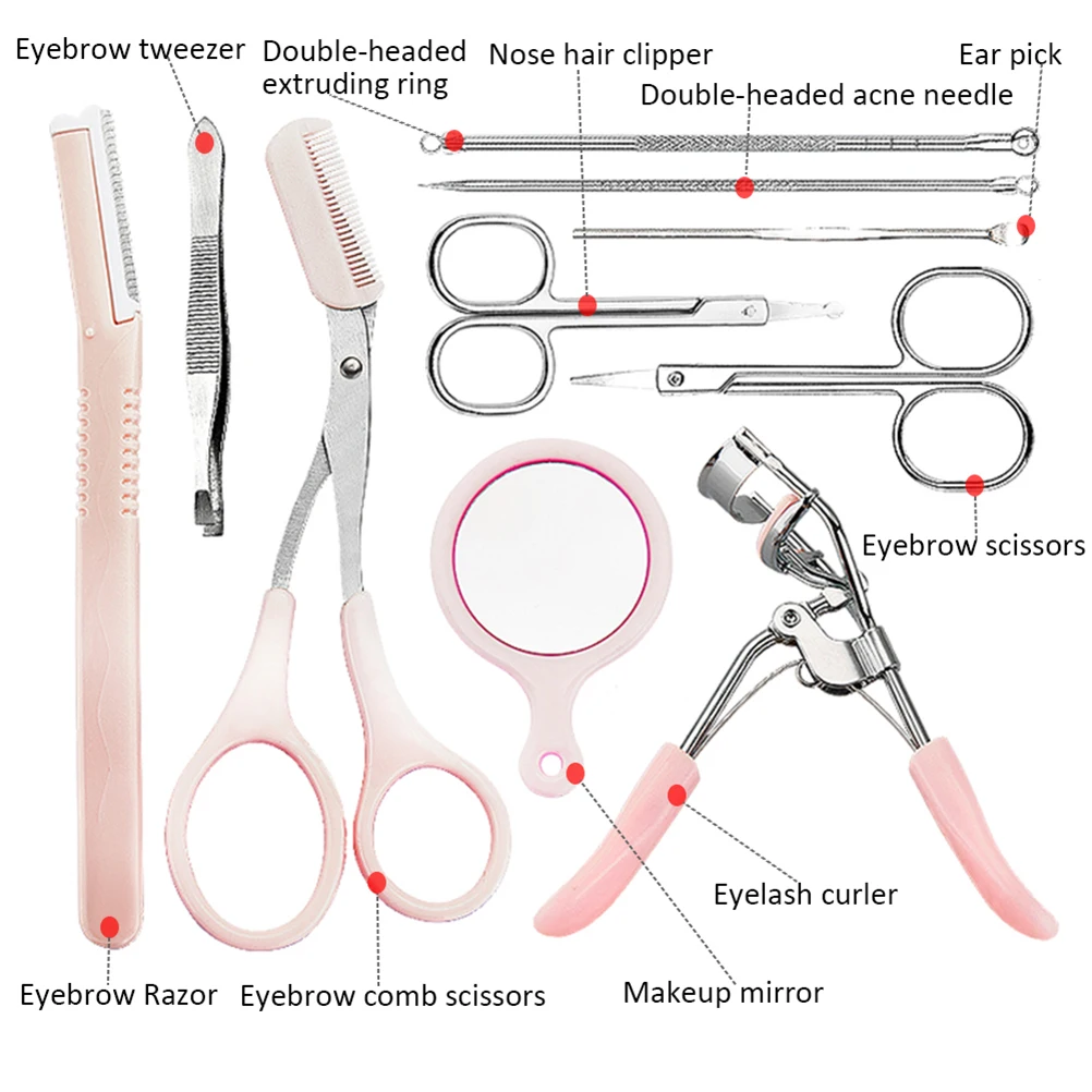 10Pcs eyebrow kit includes combing eyebrow scissors, eyebrow trimmer, eyebrow tweezers, double end extrusion pen, double headed acne needle, ears picker, eyebrow scissors, small mirror, eyelash curler, achieve your requirement.