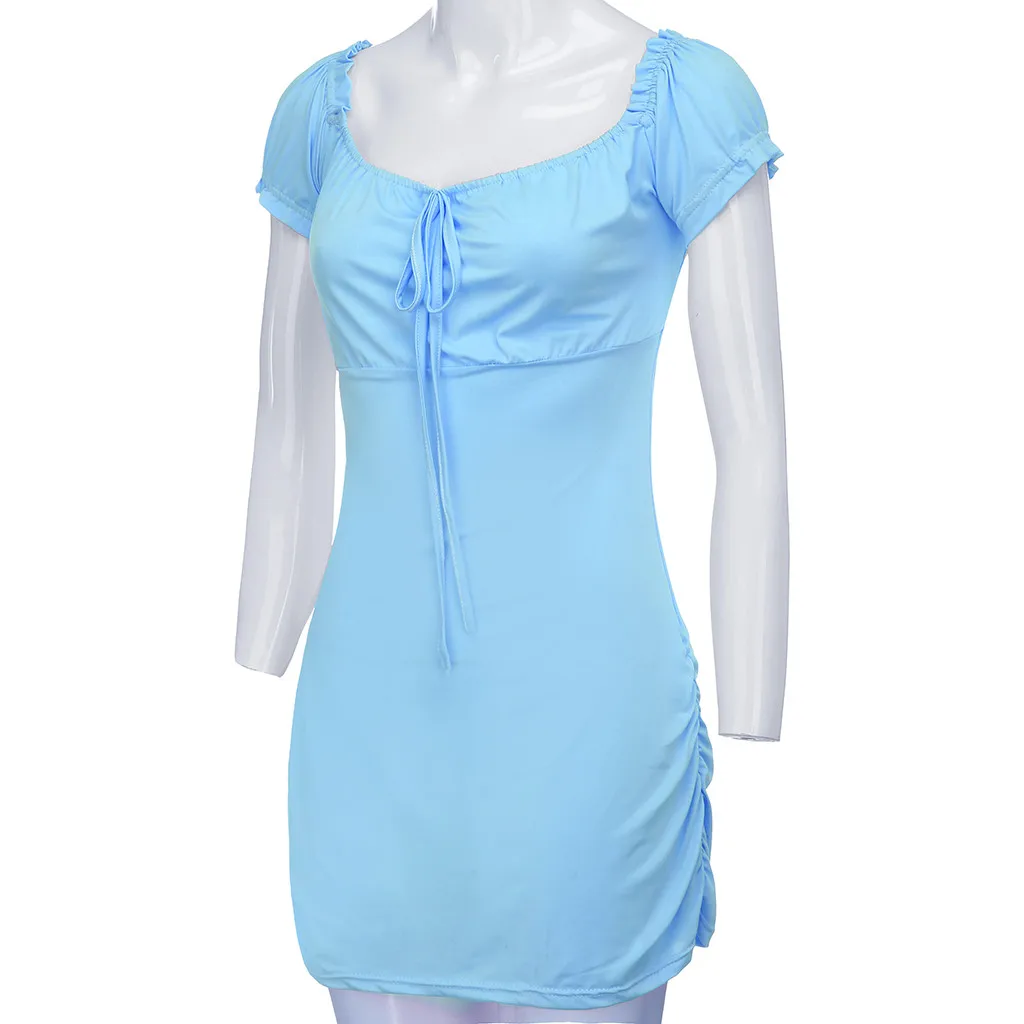 Женское летнее однотонное мини-платье с квадратным вырезом и коротким рукавом на шнуровке с рюшами