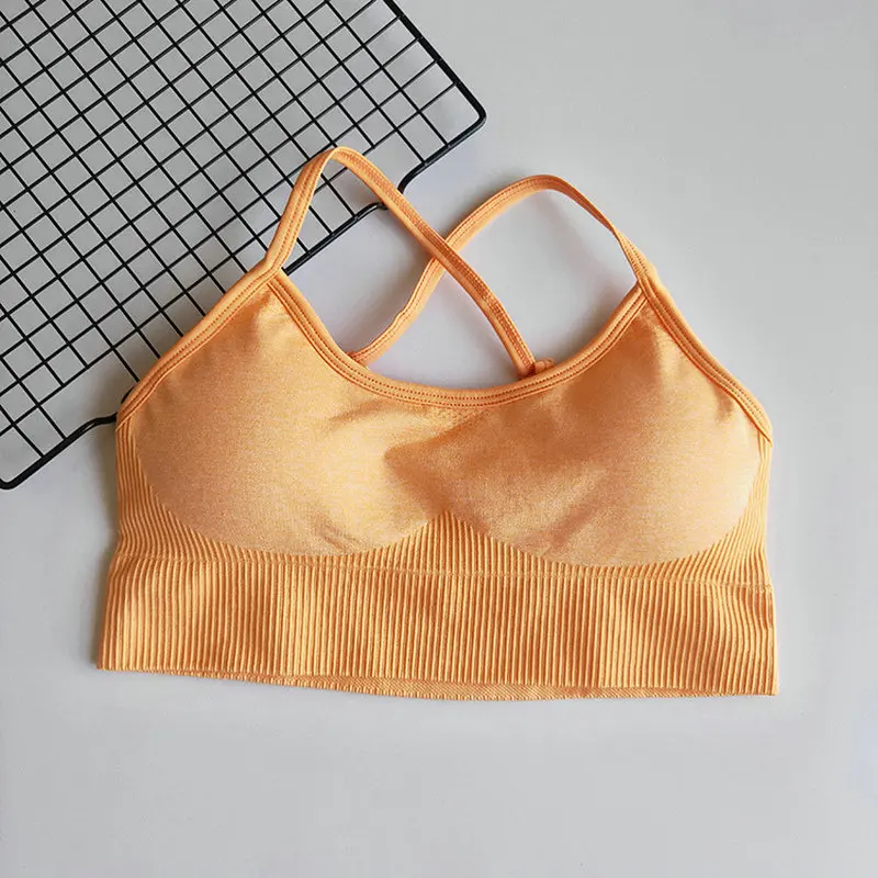 Энергетический бесшовный спортивный бюстгальтер имеет ребристую и мягкую ткань, со съемными подушечками; Дизайн с перекрестными ремешками сзади.