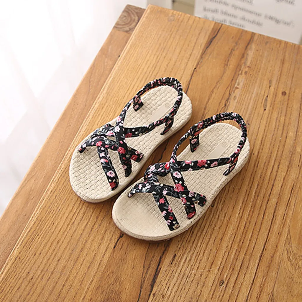 Детская одеждаДетские сандалии с цветочным принтом и перекрестными ремешками для девочек; пляжная повседневная обувь принцессы