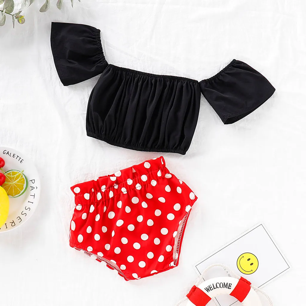 Одежда для детей и малышей, топы с открытыми плечами для девочек, комплект с шортами в горошек, одежда mode enfant fille conjuntos menina, Детские комплекты
