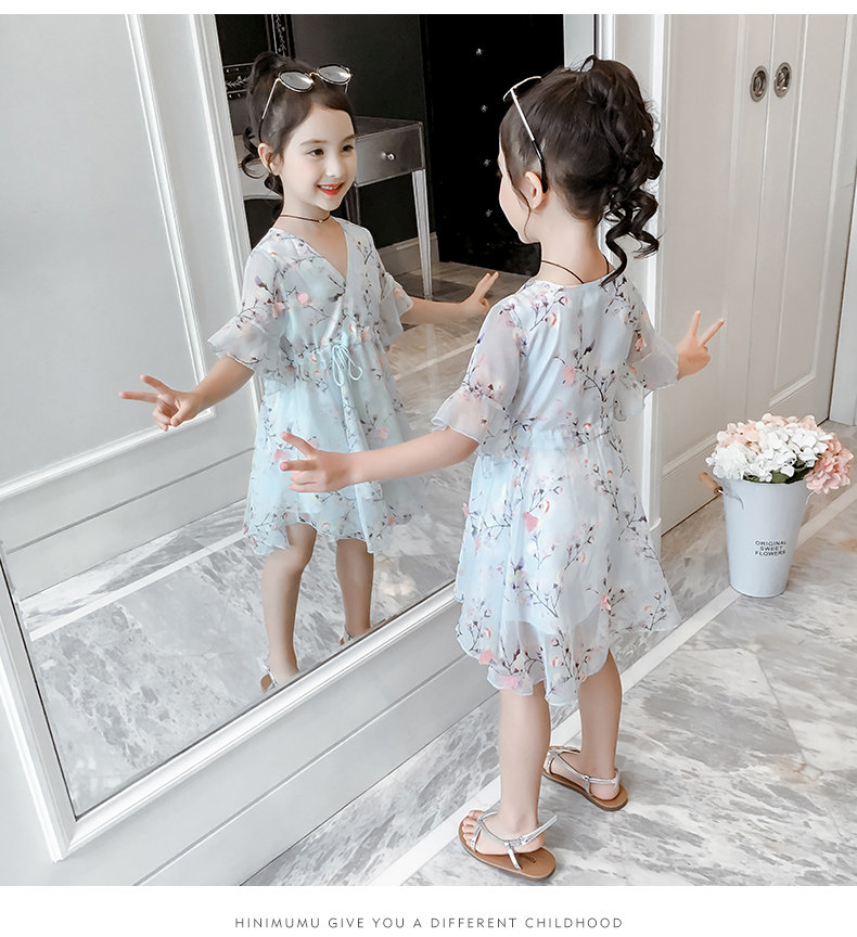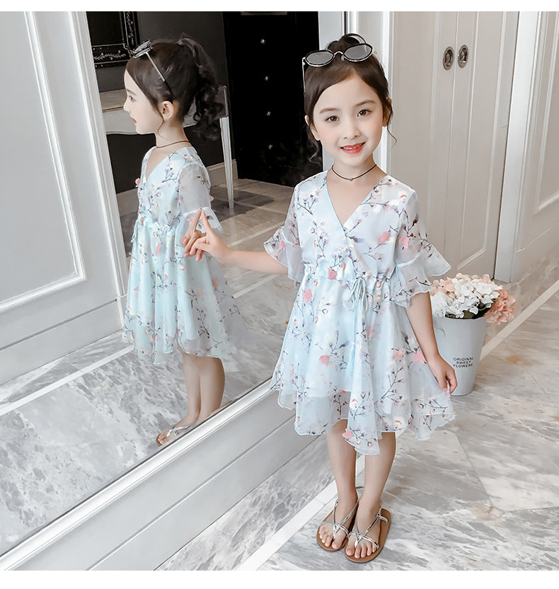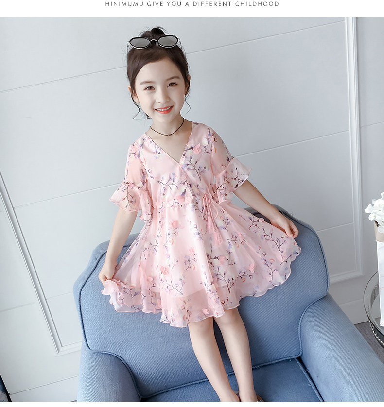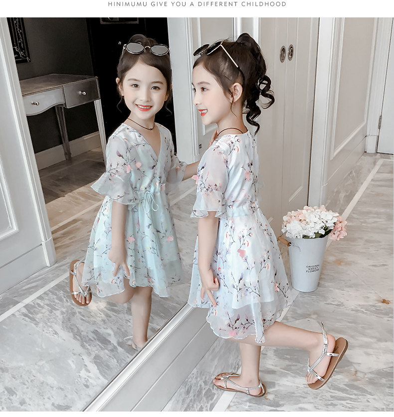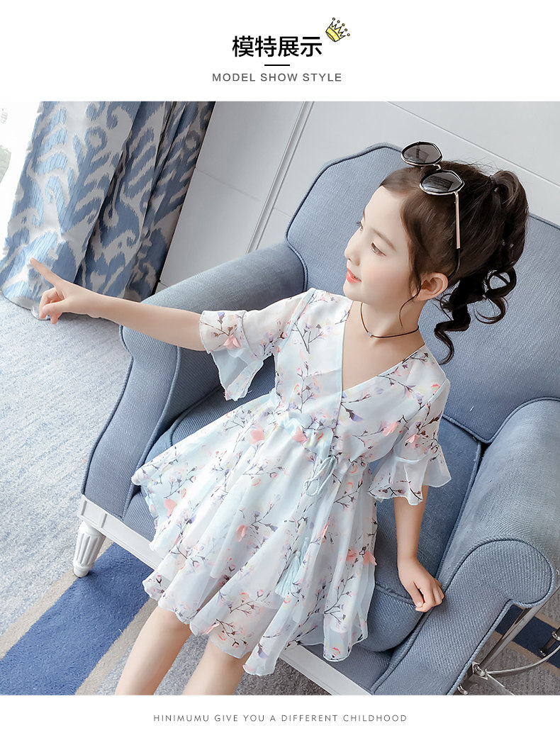 Одежда hanfu для девочек с v-образным вырезом и расклешенными рукавами, шифоновое платье трапециевидной формы, пляжные корейские модные платья синего и розового цвета, лето 2019