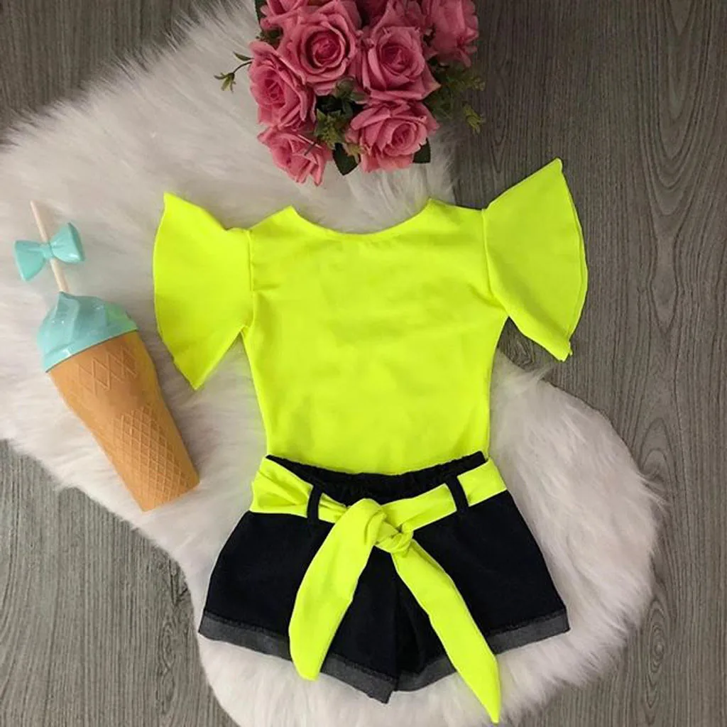 Комплект одежды для маленьких девочек: однотонный топ с короткими рукавами и оборками + джинсовые шорты