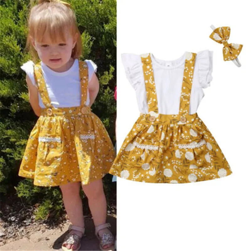 Кружевная футболка с цветочным принтом и оборками для маленьких девочек; юбка на подтяжках; одежда