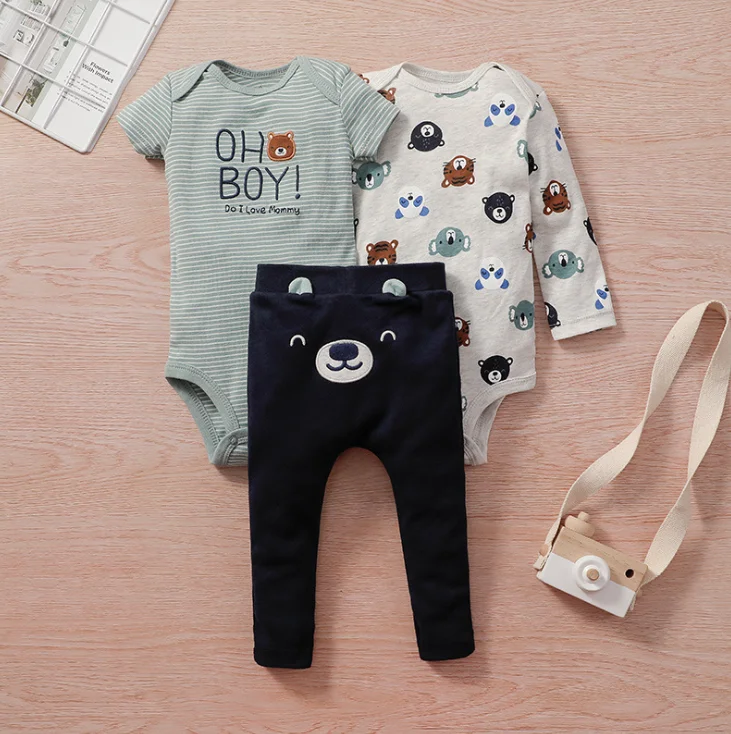 Newborn Infant Baby Boy Girl Clothing Set Cartoon Floral Stripe Long sleeve bodysuit+Short Sleeve jumpsuits+Pants 3Pieces Sets