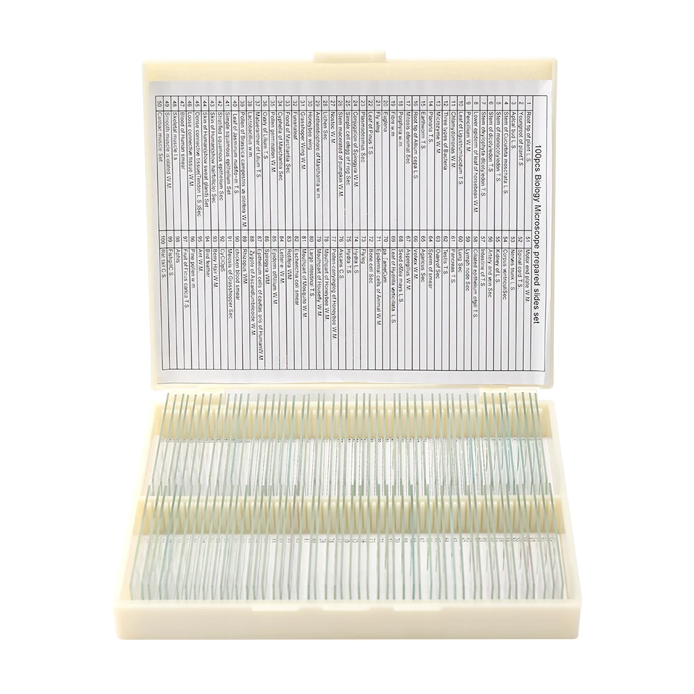 100 готовых слайдов, включая растения, насекомые и ткани животных. Изысканные образцы выбираются из различных категорий. Подходит для использования в биологическом обучении. Отличительный подарок для детей!