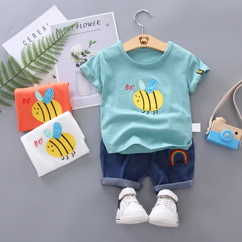 Новинка; Летняя одежда для новорожденных мальчиков и девочек; Детская хлопковая одежда с короткими рукавами; 2 шт./компл.; Модная детская спортивная одежда с рисунком; Спортивный костюм для От 0 до 4 лет