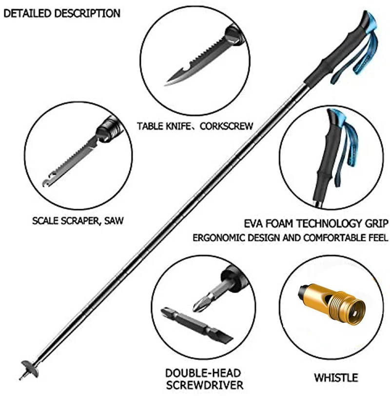 Материалы: корпус полюса изготовлен из небьющегося, устойчивого и прочного авиационного алюминиевого сплава 6061, Т6 термообработан для дополнительной твердости; настоящая прочная новая версия, все в одном дизайнерском наборе инструментов или прогулочном полюсе для внутреннего и наружного использования.