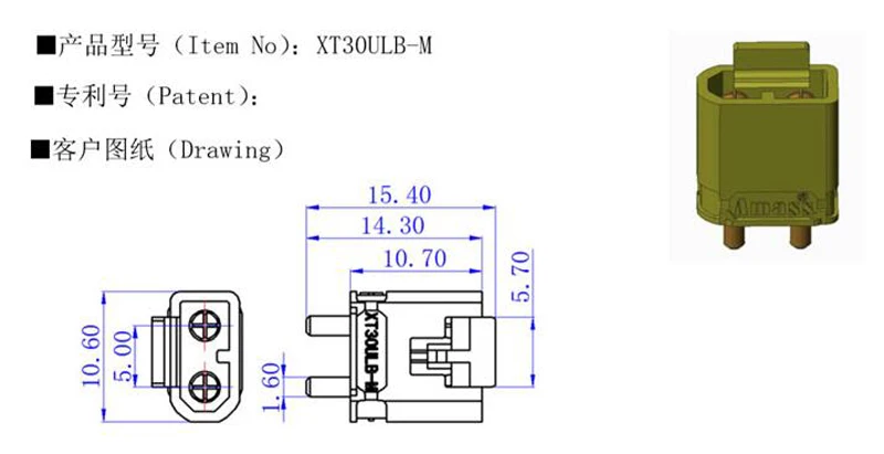 Коннектор Amass XT30ULB XT30ULW Мужской Женский Разъем Пуля разъем адаптера с Покрытие оболочки для Lipo Батарея Зарядное устройство RC печатная плата контроллераНомер товара: XT30ULW-F/XT60ULB-MМатериал металла: латунь позолотаПластиковый материал: PA66 DF25 V0Уровень FR: UL94 V0Рекомендуемое использование: контроллер/зарядное устройствоСертификация: CE/ULMeld Металл:/CR: 0,65 м ОмНоминальное напряжение: 500 Вт постоянного токаНоминальный ток: 15аМгновенный ток: 30AВремя использования: 1000 разХарактеристики кабеля: PCBТемпература: от-40 до 120Спецификация:1. Женская головка и хвост с защитным рукавом, термоусадочная трубка.2. Мужской и женский с зажимом, благодаря компактной конструкции, увеличьте дизайн замка, чтобы предотвратить затычку.3. Наружный конец должен быть женским концом сварочной линии печатной платы (90 градусов сварки).4. Женская сварочная линия (90)30 серий 90 градусов, для удовлетворения специальных требований к пространству БПЛА.В комплект входит:Штепсельная Вилка Amass XT30ULW 10X10X Amass XT30ULB штекерИли20X Amass XT30ULB штекерИлиШтепсельная Вилка Amass XT30ULW 20X