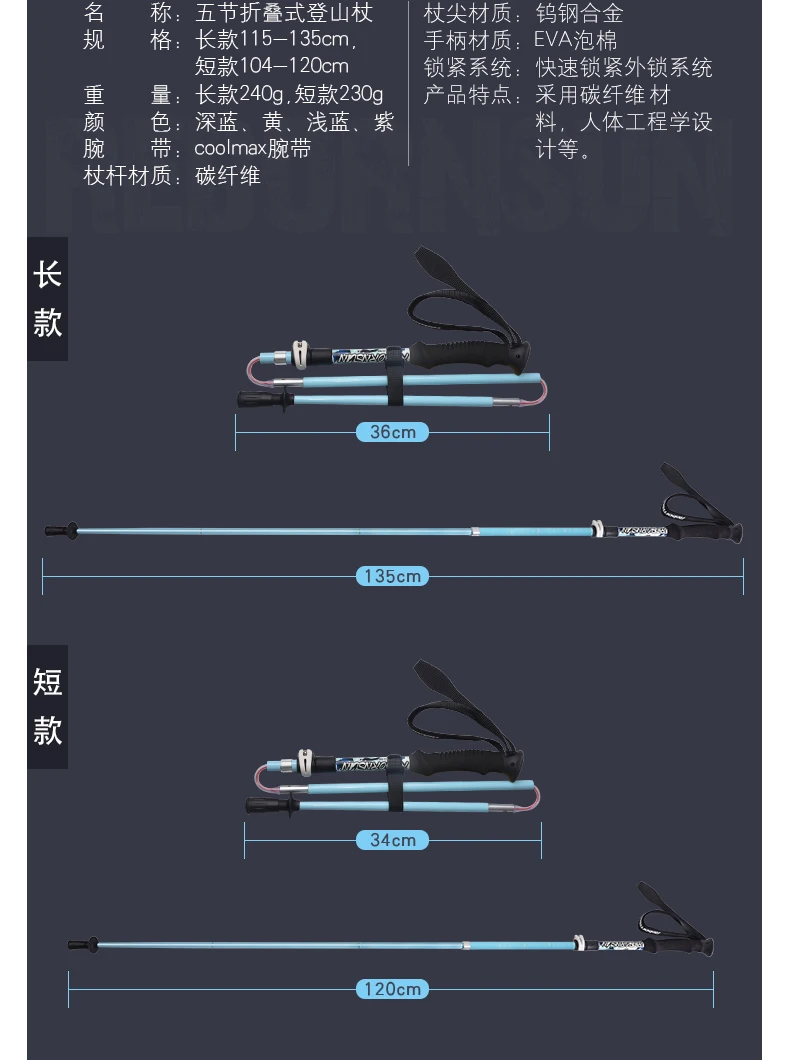 1. Цена указана за одну походную палку. 2. Если вам нужна пара из них, пожалуйста, заказывайте с суммой 3. Длина 115-135 см Короткий стиль длина 105-120 см 4. С 5 секциями, самый короткий размер 34-36 см 5. Прочное соединение 6 регулируемый ремешок на запястье и сцепление удобны для удержания и впитывания пота 7. Деликатный треккинг (Грязь/снег/песок) одеяло и съемный колпачок