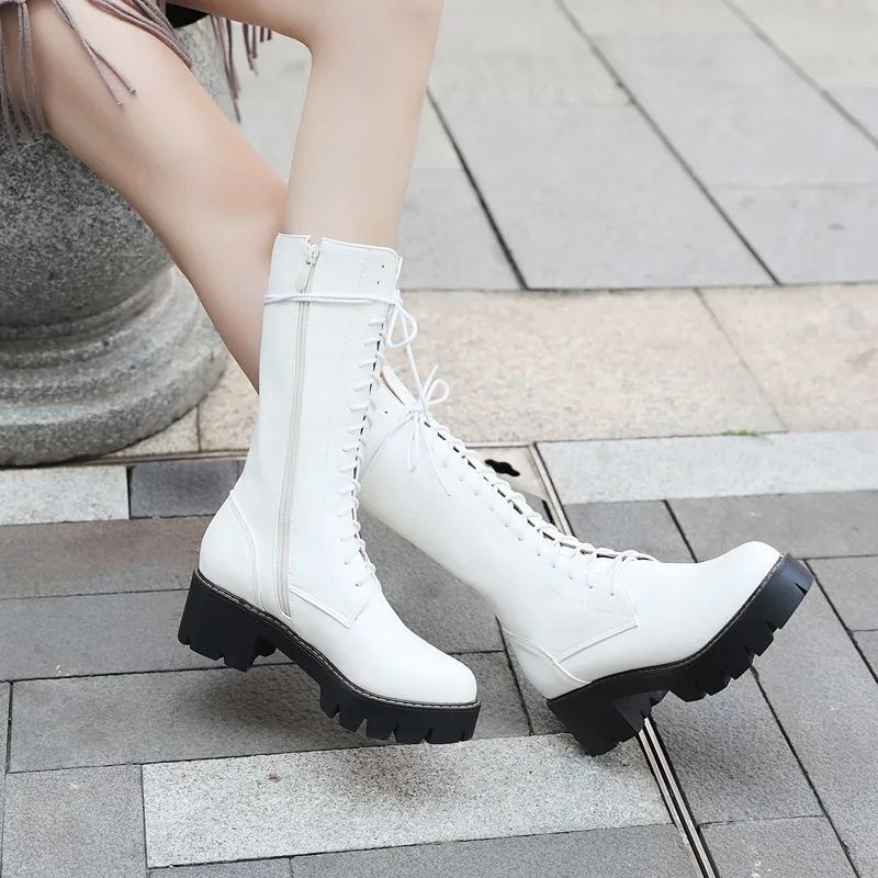 Сапоги до середины икры из искусственной кожи на платформе; Женская Осенняя обувь с круглым носком; Новинка 2019 года; Модные женские ботинки на шнуровке; цвет черный, белый, темно-коричневый; E078