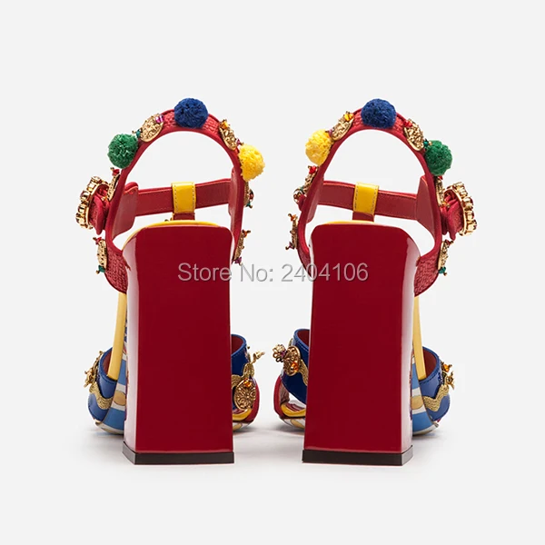 EtЖенские разноцветные сандалии-гладиаторы с Т-образным ремешком, украшенные стразами и аппликацией; Женская обувь для подиума; Босоножки на высоком массивном каблуке с ремешком и пряжкой