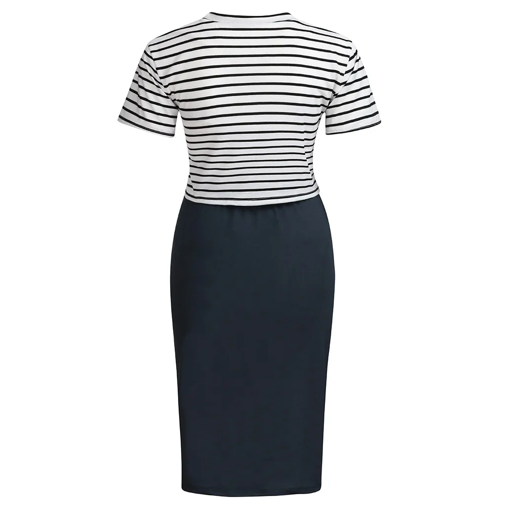 Women's Maternity Pregnanty O-Neck Short Sleeve Summer Stripe Split Dress