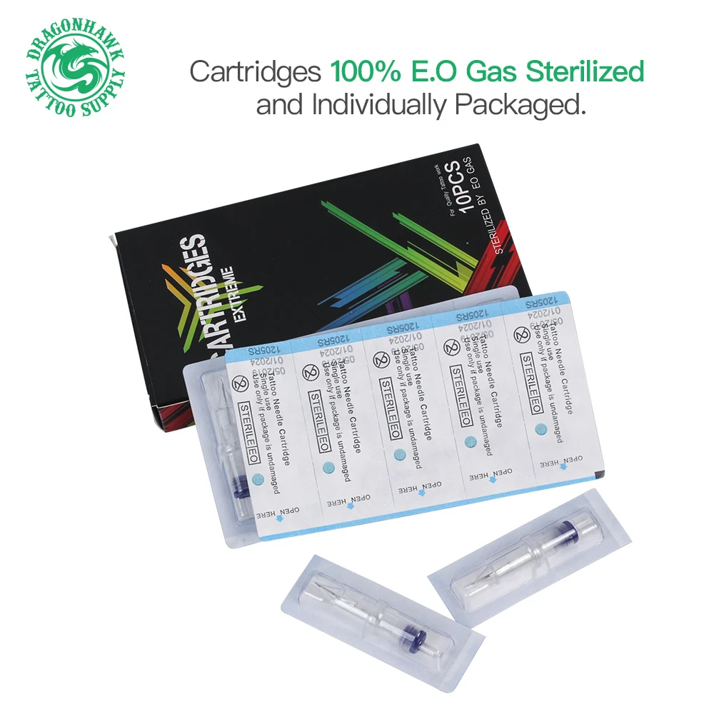 О продукте: картриджи с рангоутом Dragonhawk, быстрый отскок, E.O газовый стерилизованный. Одна игла обеспечивает максимальную стабильность и контроль вдавливания на кончике увеличивает поток чернил и насыщенность. Мембранный механизм предотвращает попадание чернил спицами из нержавеющей стали 316 медицинского класса. Совместимость со всеми популярными ручными машинами и картриджами обеспечивает высокую прочность и прочность при длительной работе.