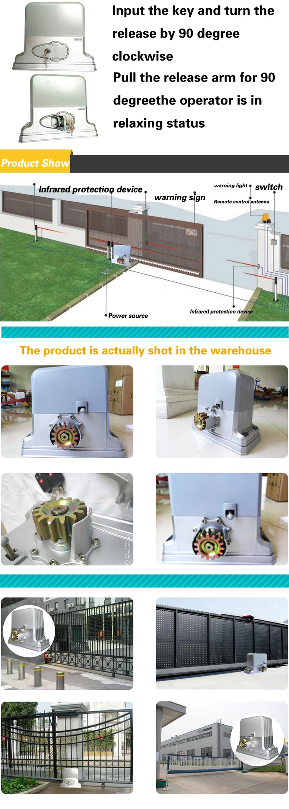 1. Защита от атмосферных воздействий 2. Ручное управление 3. Все металлические шестерни 4. Металлический привод 5. Все в одном внутренний мотор и Погодостойкая панель управления 6. В некоторых странах холодный климат, мы добавляем антифриз масло внутри двигателя, он может работать в среде-25 °