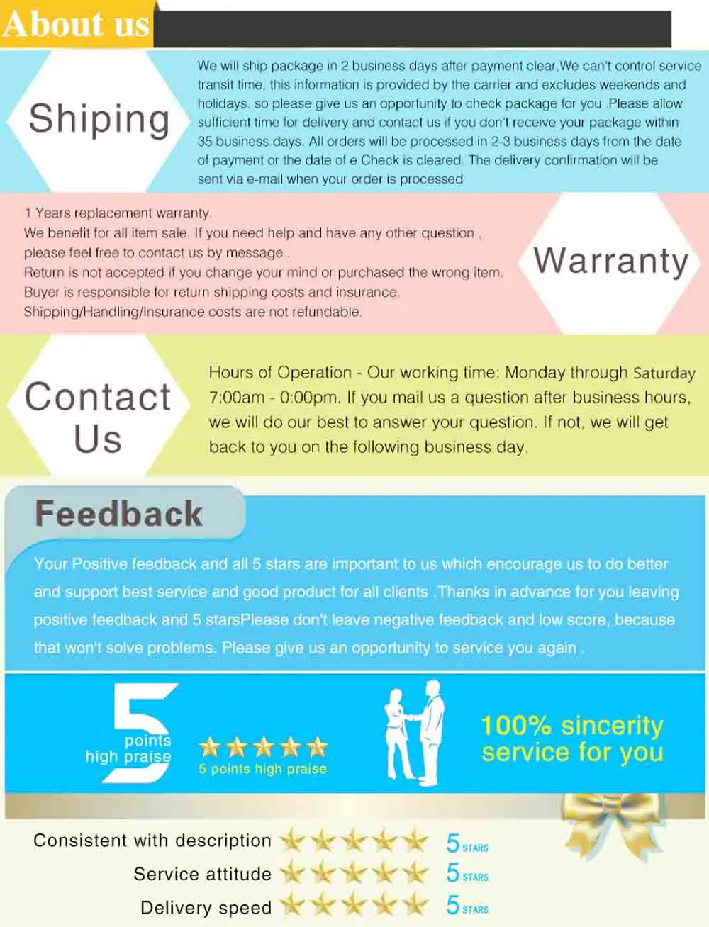 * О дистанционном управлении, мы доставляем его без батареи. Потому что это чувствительный продукт, это авиакомпания Контроль. Вы можете легко купить его на местном уровне. * О стоимости доставки, если вы думаете, что это невероятно высоко, вы можете попросить продавца скидку. Мы всегда Дайте нашим клиентам лучшую цену. * Если вы выбираете посылка в комплекте, пожалуйста, будьте уверены, что вся посылка в комплекте будет отправлена вам. * В процессе покупки у вас есть какие-либо вопросы, или проблемы с ценами и доставкой могут отправить мне сообщение по электронной почте, я получу информацию в первый раз с вами, чтобы обсудить лучшее решение, И желаем вам приятных покупок, спасибо. Телефон и WhatsApp :+ 86 13717079346 Электронная почта: kingjoin86@sina.com 1. Пожалуйста, установите выключатель питания утечки на основной мощности. 2. При подключении отключите основную мощность. 3. Электрические продукты должны быть заземлены. 4. Высокое напряжение является опасным, если вы не профессионалы, пожалуйста, не разбирайте и не ремонтируйте