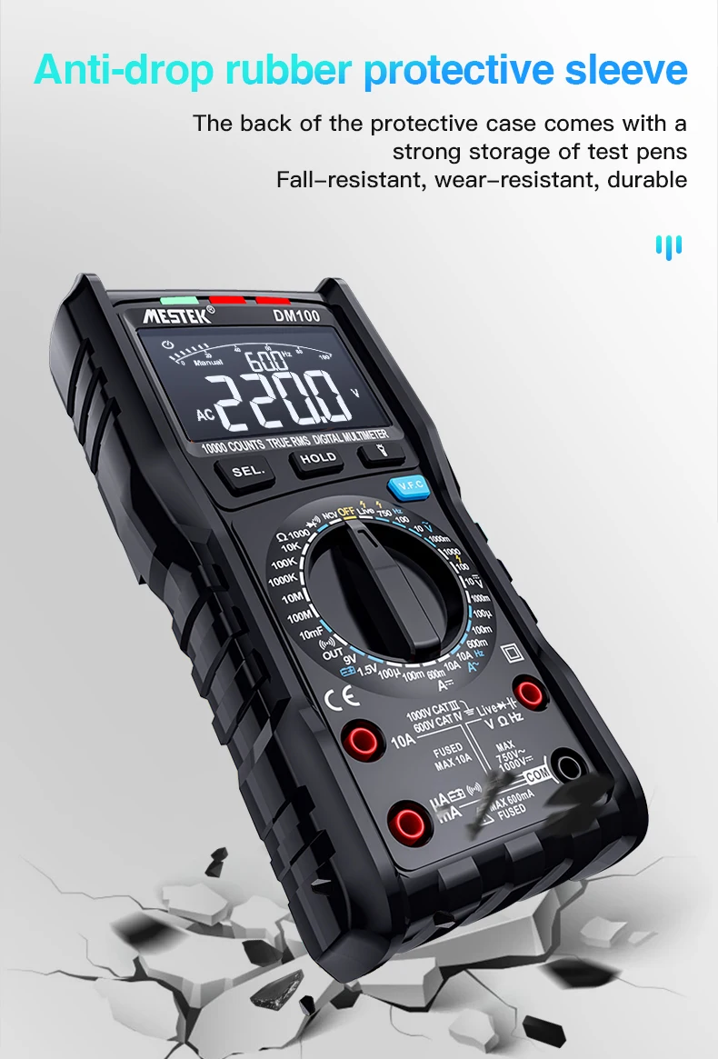 Умные измерения, Интеллектуальный сдвиг, 6000 подсчетов дисплея, AC/DC напряжение, ВКЛ-ВЫКЛ зуммер/диод, Интеллектуальное распознавание, емкость, сопротивление, Бесконтактный тест напряжения, T-RMS, подсветка/фонарик/1,5 v/9В батареи измерения, фиксация данных, Автоматическое отключение питания