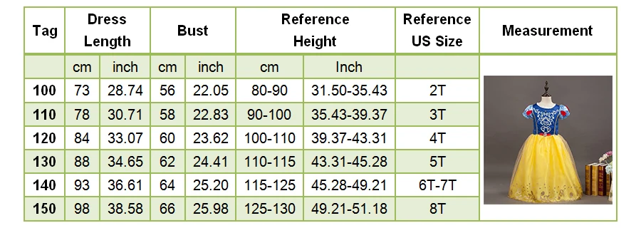 Especially the snow white dress would be larger than other dresses. Please check the size chart before making the purchase, or contact seller to choose a better size. Or we will have no duty on it. Thanks!