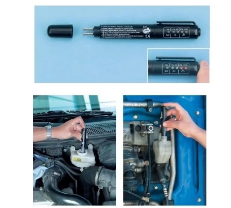 Ручка обнаружения тормозной жидкости основана на изменении проводимости для определения влажности тормозной жидкости. Он четко показывает степень влажности, содержащую светильник-излучающий диод, высокое содержание влаги приведет к более низкой температуре кипения, влияет на эффективность торможения. Красный цвет означает, что Тормозная жидкость нуждается в немедленном замене, зеленый цвет представляет хорошее состояние, желтый цвет означает, что состояние приемлемо, но вскоре заменяется.