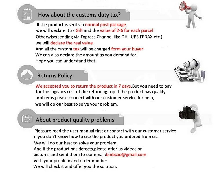 1. Не оригинальная коробка. Пожалуйста, обратите внимание, что вместо оригинальной коробки мы используем пенопластовую коробку. 2. Для российских покупателей, согласно скорректированной Почтовой Политике России, имя грузополучателя должно быть полное имя. 3. Если у вас возникли проблемы с качеством, пожалуйста, сначала свяжитесь с нами. Спасибо за понимание.