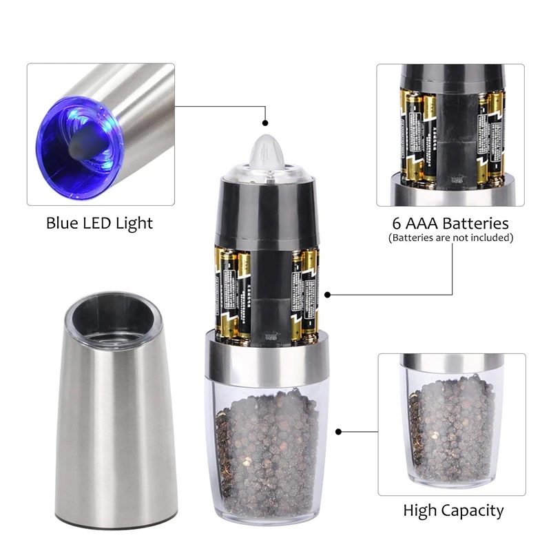 Гравитационная операция-просто Инвертируйте шлифовальную машину, затем она автоматически измельчит соль и приправы, Синяя светодиодная лампа также будет активирована, что полезно при использовании в темной среде, удобно и легко управляется только одной рукой.