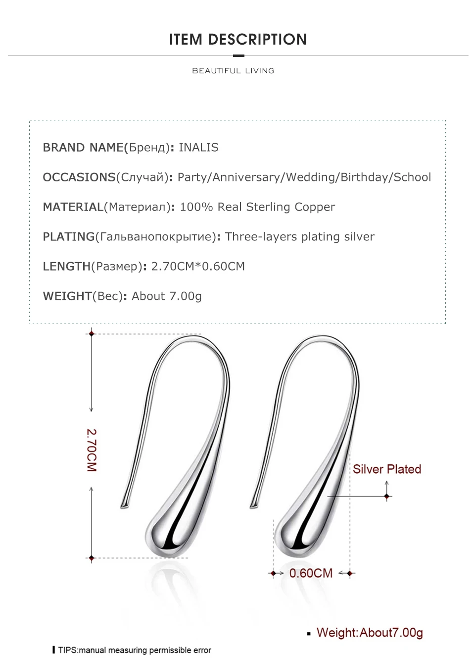 Фирменное наименование: INALIS Случаи: свадьба, подарки для девушки, юбилей, вечерние Материал: натуральная стерлинговая медь Покрытие: трехслойное серебряное покрытие Вес: около 7 г