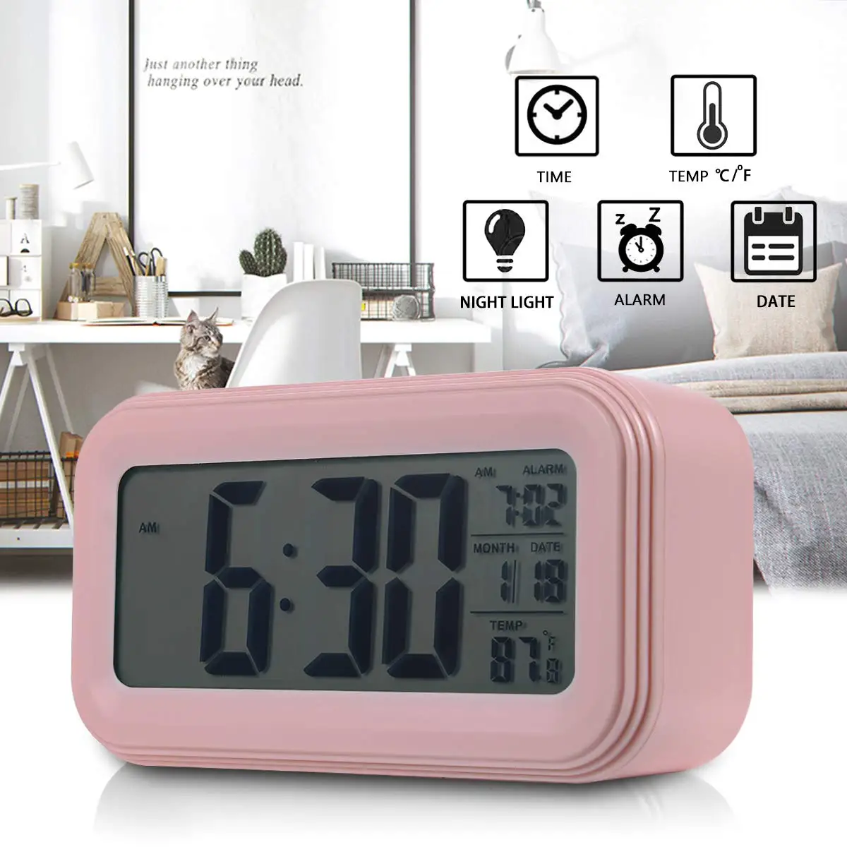 Домашний офис декор настольные часы цифровой будильник Особенности -Большой ЖК-дисплей с ярким легко видимым типом позволяет проверить время с первого взгляда. -Конвертируемая ℉ & ℃, 12 ч и 24 ч с простой работой. -Весь размер ладони и питание от аккумулятора, его можно хранить в сумке во время путешествия. -Когда будильник активирован, часы издают звуковой сигнал в течение 60 секунд В crescendo -В ночное время вручную нажмите кнопку light, чтобы поднять короткую полную подсветку, которая прослужит 5 секунд, затем выключается в режим экономии энергии. -Включите кнопку сенсора, подсветка автоматически останется видимой ярче, чтобы поднять ночной вид. Мягкий ночник прослужит всю ночь до следующего утра. Упаковочный лист • 1 * цифровой будильник • 1 * Руководство пользователя Уведомление: Питание от 3х батареек AAA (не входят в комплект).