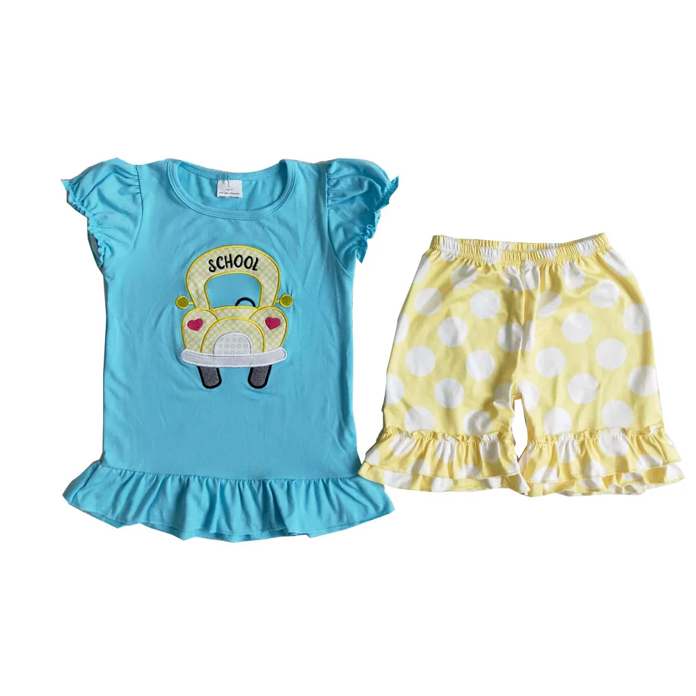 Новое поступление, школьная одежда с автобусом Милая синяя футболка с рисунком для маленьких девочек + шорты в горошек комплекты из 2 предметов детская одежда с вышивкой