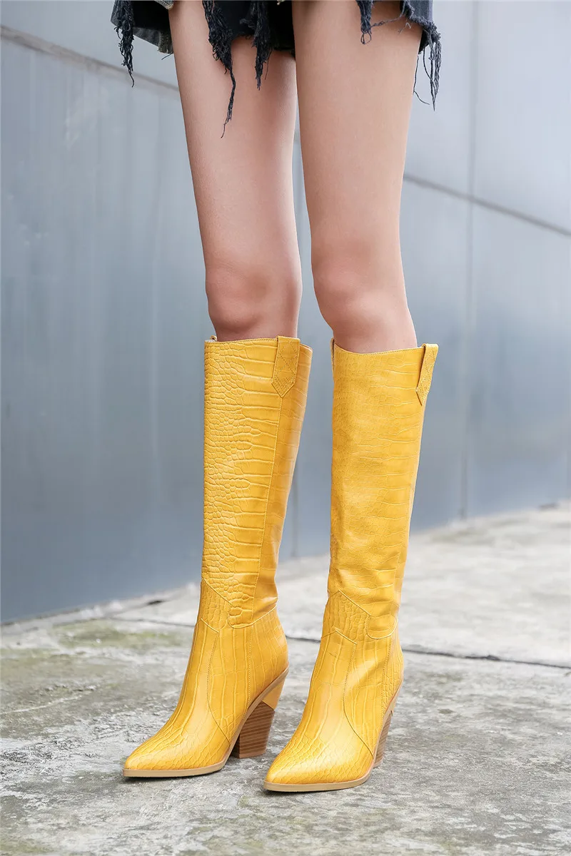 Модные женские ковбойские сапоги YMECHIC 2019 желтого и черного цветов на блочном